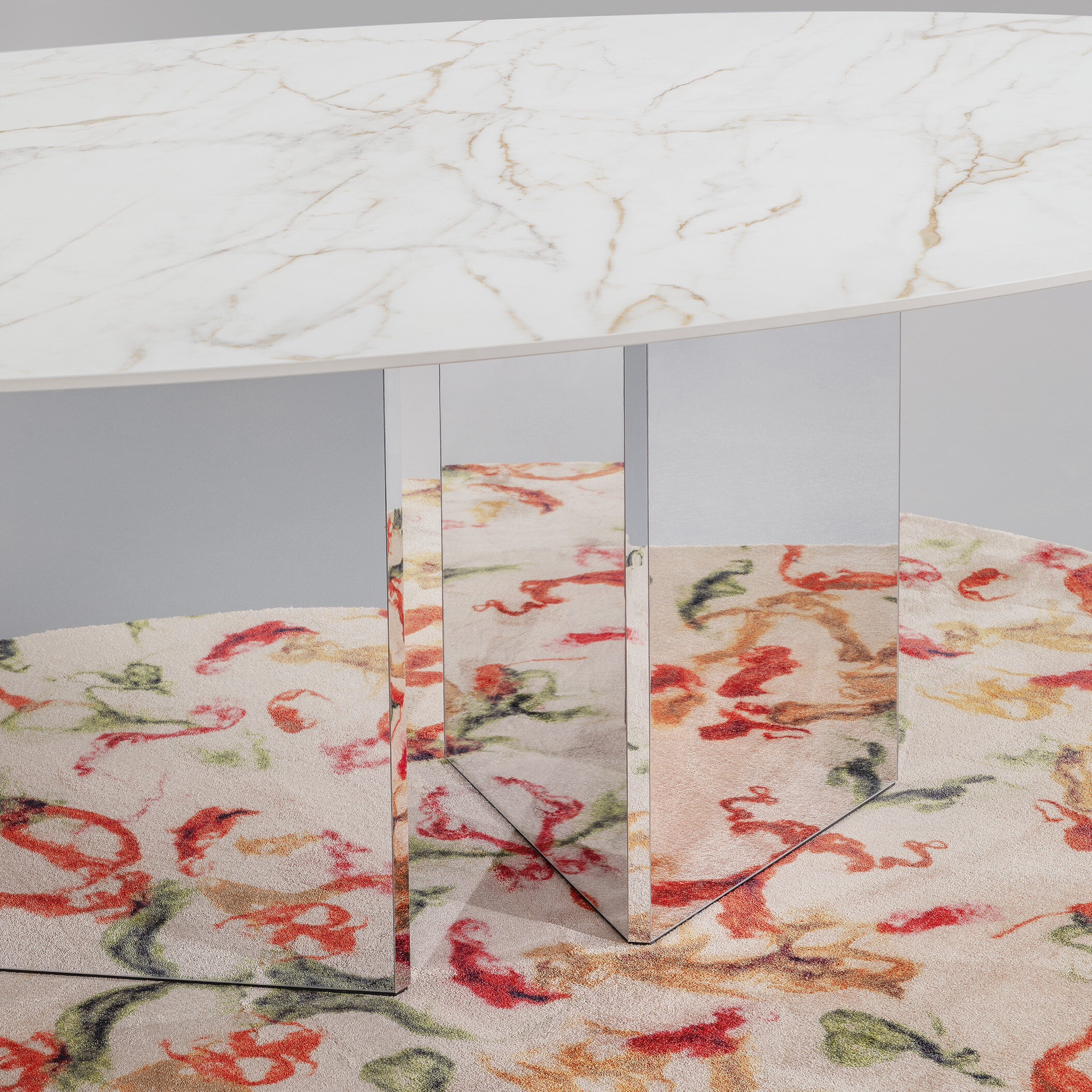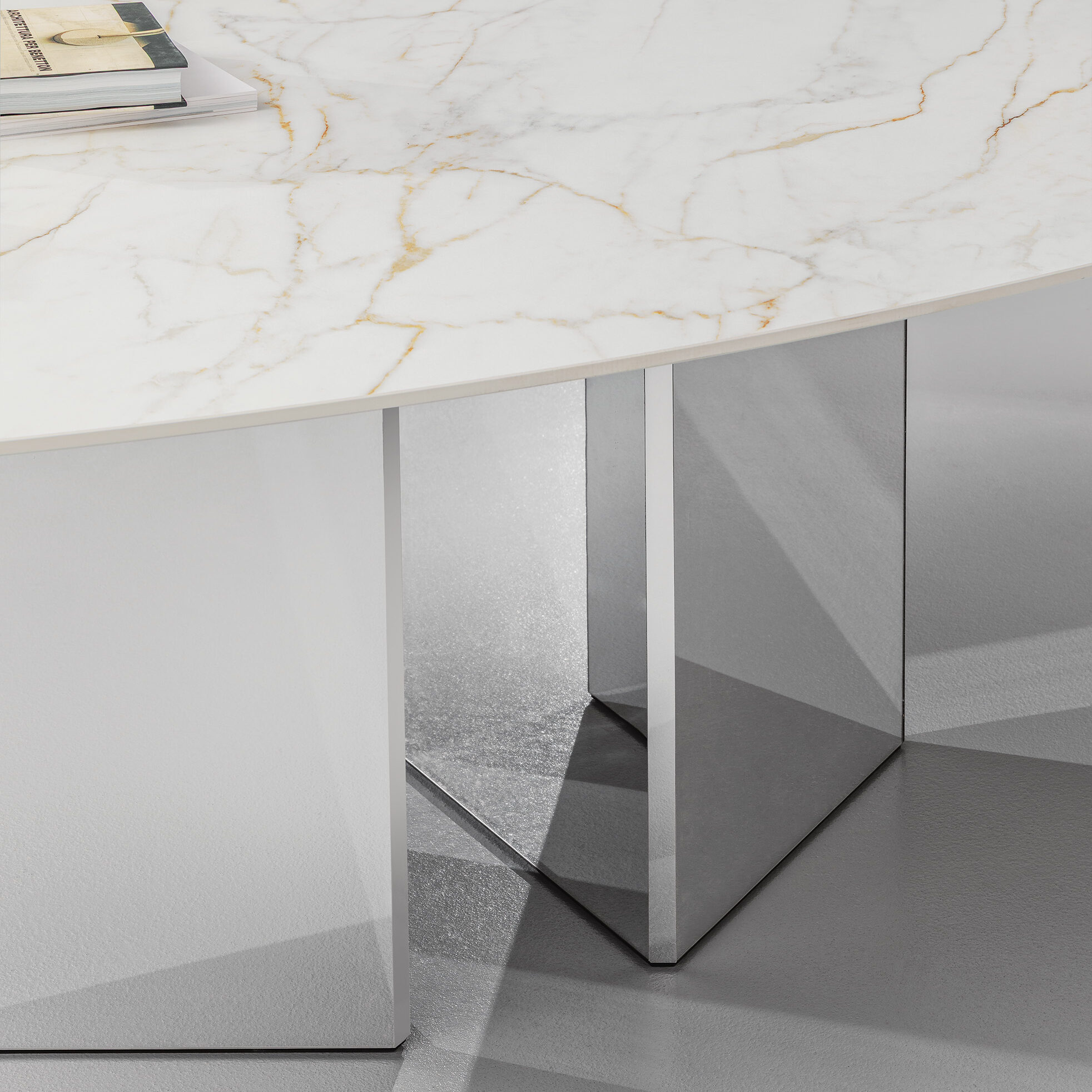 The harmony of the Albio table conceals an imperial charm: this first version is crafted in Travertine marble, a material favoured by the Romans to build their most celebrated monuments. The top rests on sleek, faceted triangular bases. The softness of the Albio top is matched by the solid slab of its base, harmoniously combined in a single sculptural body. Finishes are available in wood, lacquer or ceramic. Configure Albio as a dining table or in a smaller coffee table version.