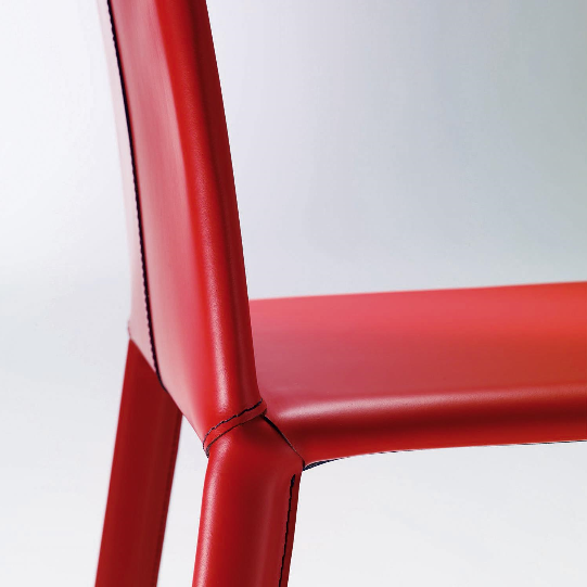 Alice is a chair with a strong yet refined character, fully upholstered in leather – a material that defines its design identity. The steel structure is hidden beneath handcrafted leather that elegantly wraps around every volume, including the legs. The stitching, either tone-on-tone or contrasting, traces clean lines that enhance the texture of the upholstery. Available with a standard or high backrest, it fits confidently into dining rooms, executive settings or high-end hospitality environments.
