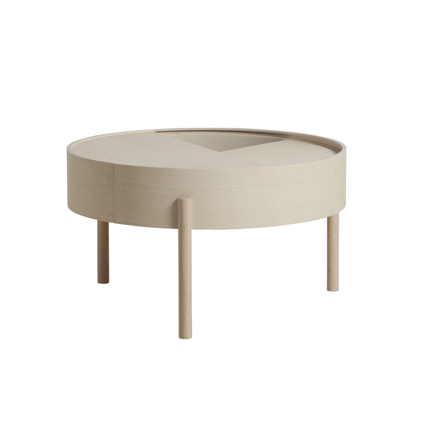 ARC takes its name from the mathematical concept of a smooth curve joining two points in a circle. The ARC table invites its user to make use of the simple functionalities, use one finger to turn the upper tabletop. Let it be open with your favorite objects on display or close the lid to hide your mess. The surface on the inside storage space is covered with a smooth nanolaminate to complement the ash wood while the three-legged construction adds a playful and light touch to the geometric shaped design.