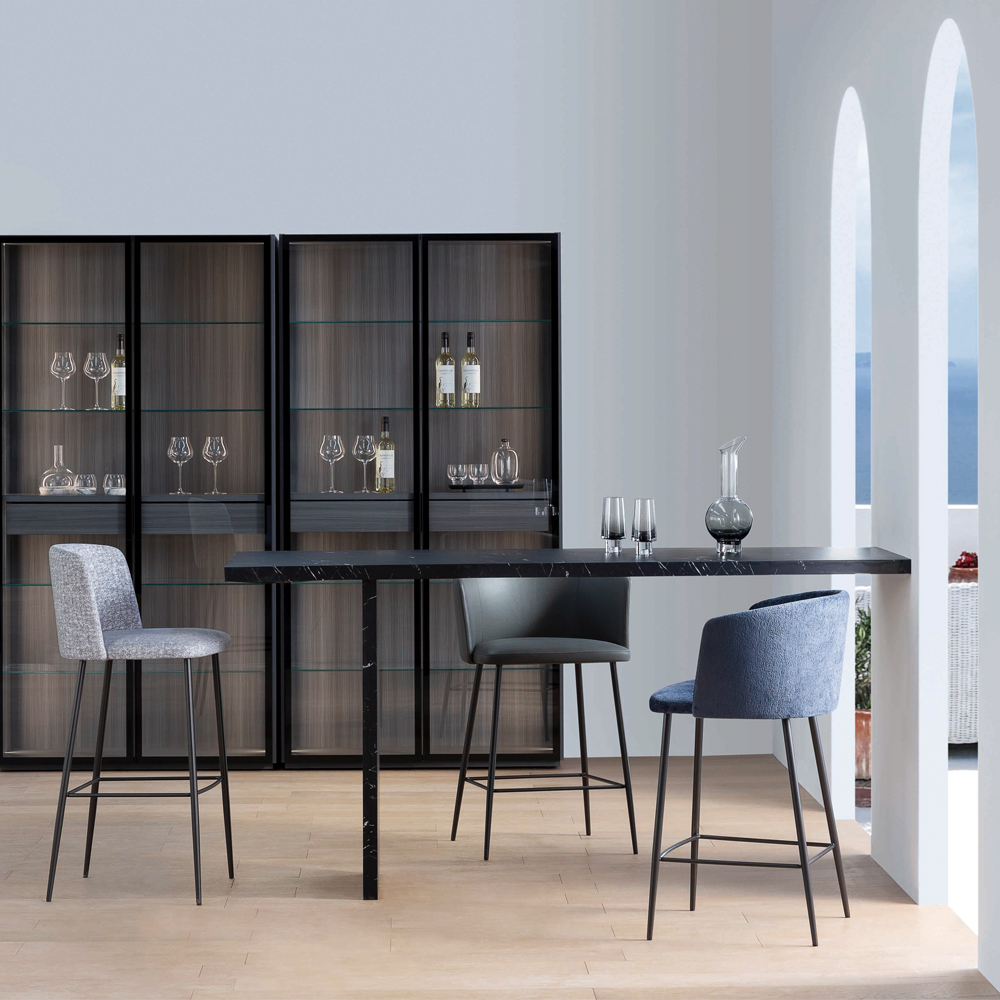 Ultra-chic and streamlined lines define the Ballet Stool. Ballet’s curved backrest demonstrates Camerich’s impeccable workmanship. This dining chair’s seat and back are padded for comfort, inviting you to linger at the dinner table. Choose from an armchair or armless version, as well as from several different base options. Ballet is available in your choice of fabric or leather upholstery to complete your dining space.