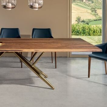 The Bridge takes its name from its iconic easel-style base. Bridge Fixed Table is available with custom metal legs, further enhanced by your choice of decorative detailing. Choose from Bontempi’s luxurious solid wood tops (complete with natural-shaped edges) in fixed configs.