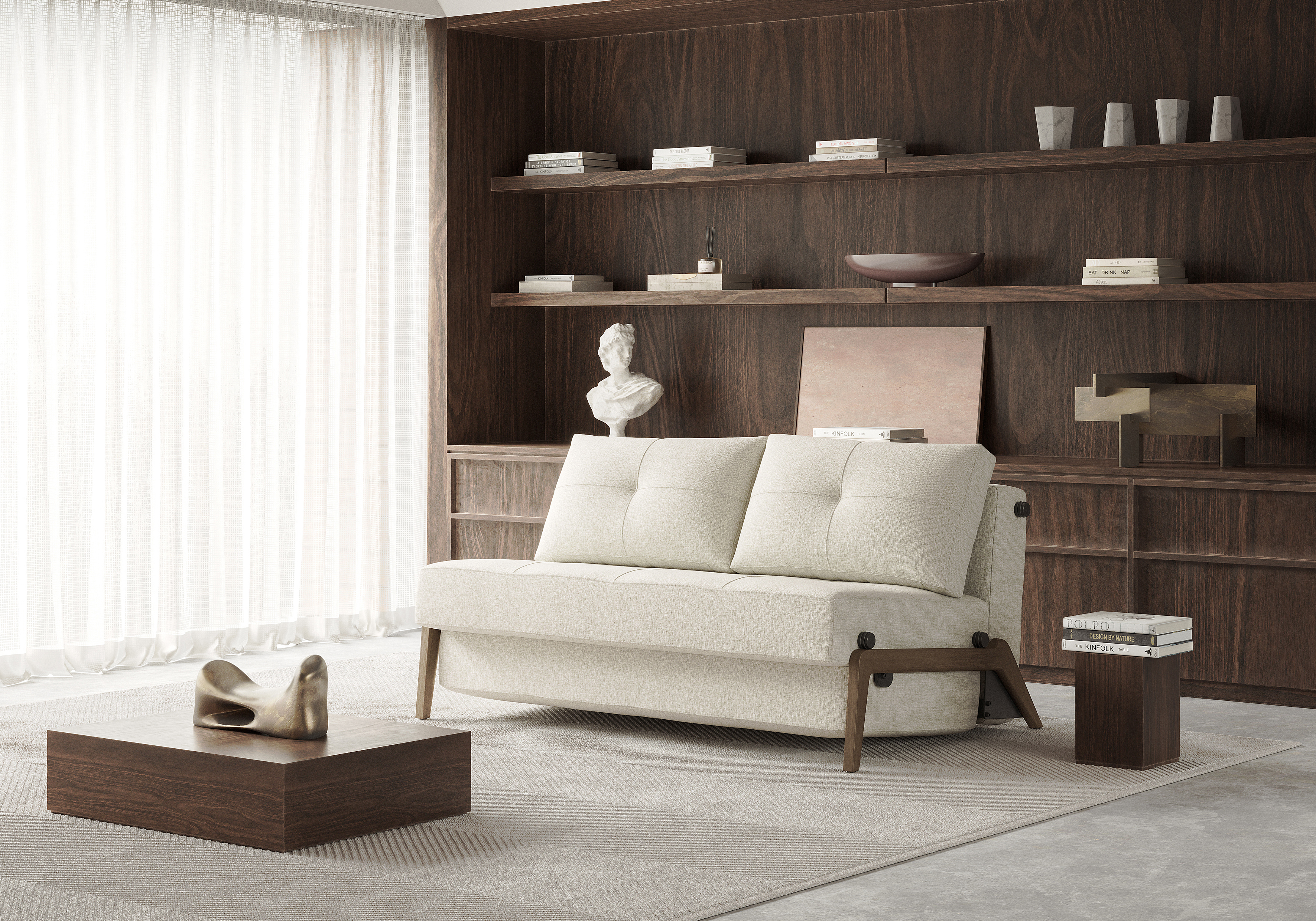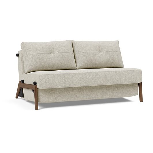 At a glance Cubed Dark Wood Sleeper Sofa is a beautiful sofa complete with wood legs, a slightly angled seat, and cozy back cushions. A compact 2-seater sofa by day, Cubed saves valuable space by folding out into a snug bed. Choose from a Full or Queen size option offered with your choice of quick ship or DIY upholstery. Cubed is outfitted with a No-zag spring mattress and a durable wood frame, ensuring a high-quality sofa bed for years to come. A small bedding box under the seat allows for easy storage of blankets and other necessities.