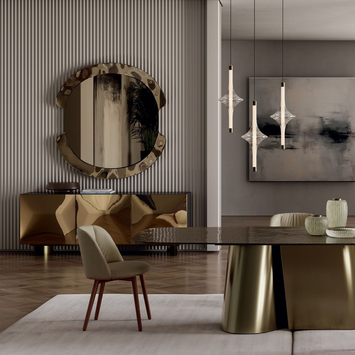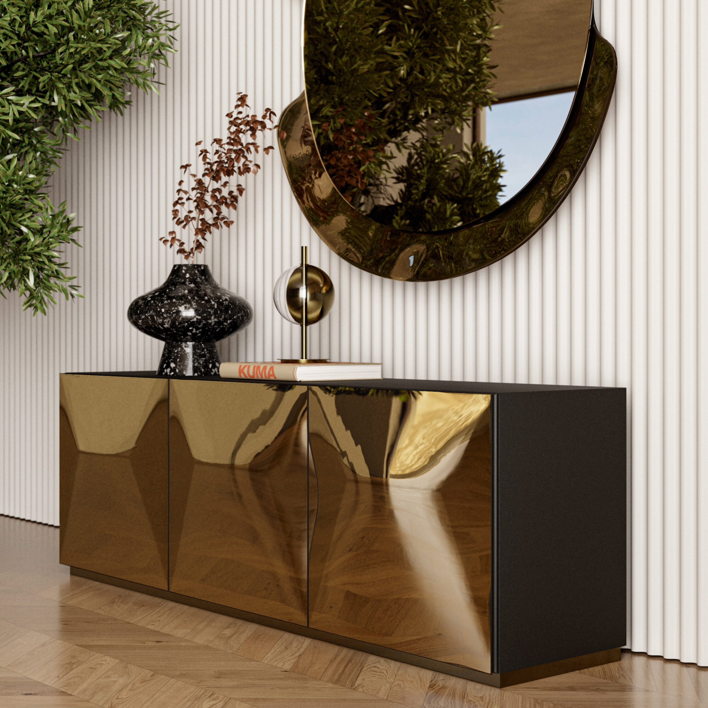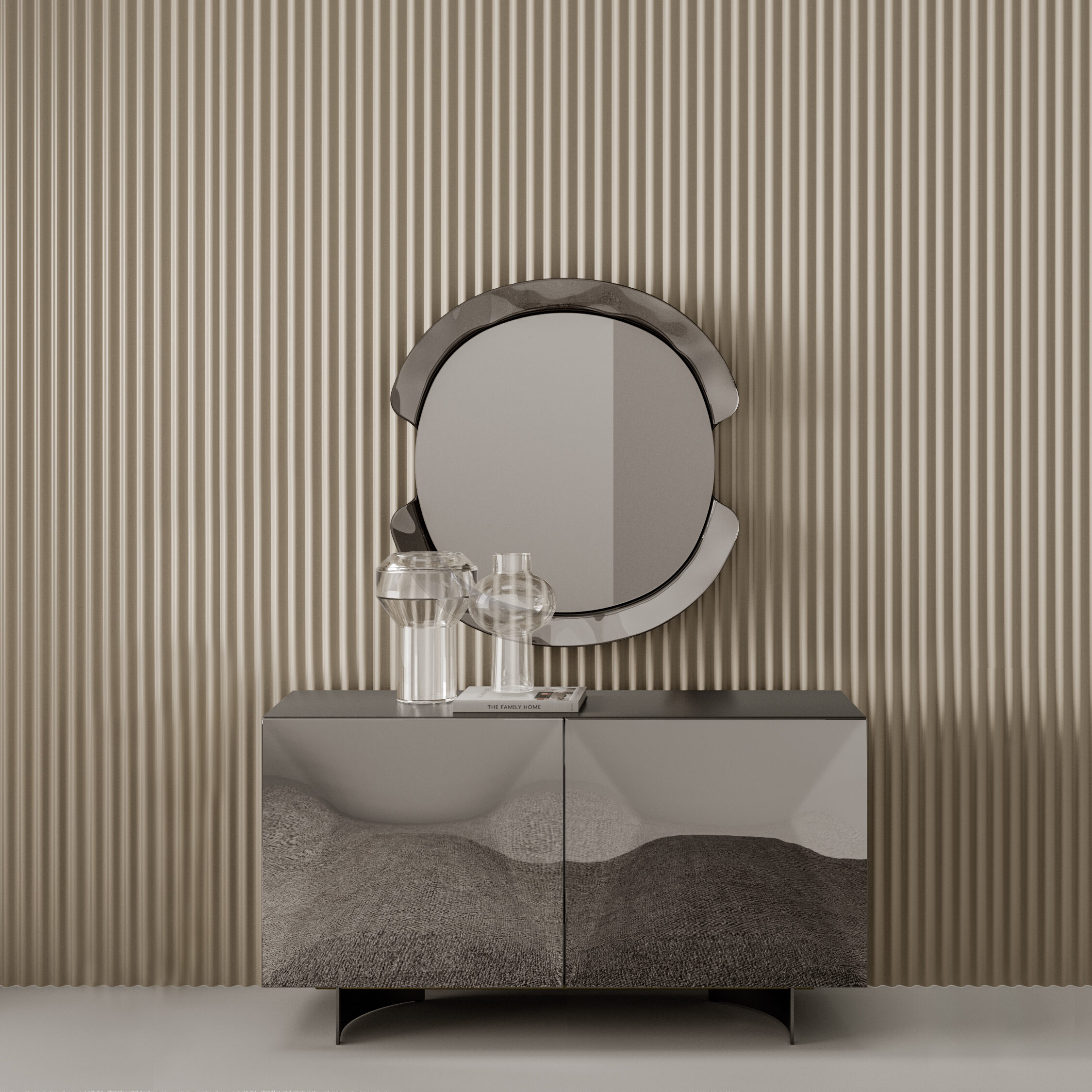 Eden, with its daring and innovative design, is a functional sculpture capable of turning the movement of light into a dance of elegance. It is a piece of furniture that becomes an integral part of a sensory experience, where surface, reflection and light are entangled in a game creating a visual poem. The camber of the skillfully crafted doors endows provides a dynamic shape that captures and extends the play of light and shadow.