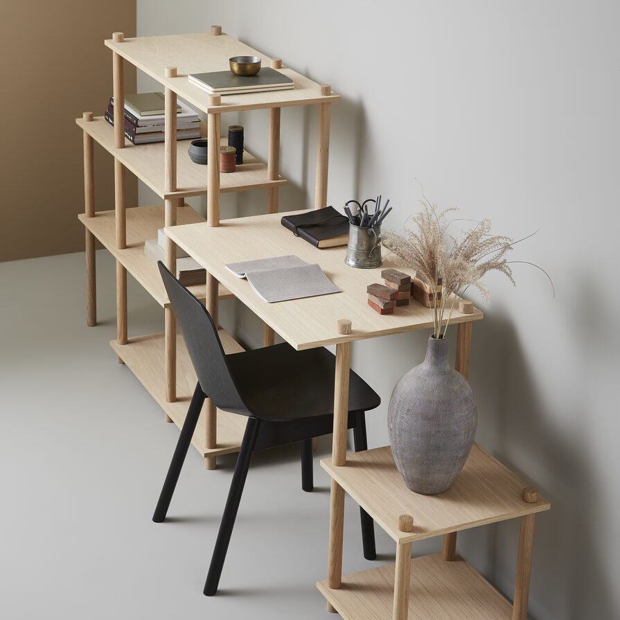 Elevate is a modular shelving system with endless possibilities. With different shelves and dowels, Elevate can be expanded and assembled in an unlimited number of permutations without the use of any tools. Just stack the shelves, tighten the dowels and then elevate them. The different elements are boxed individually in order for you to customise the exact shelving you want – matching your needs. Use it for boxes, office supplies, works of art or plants.