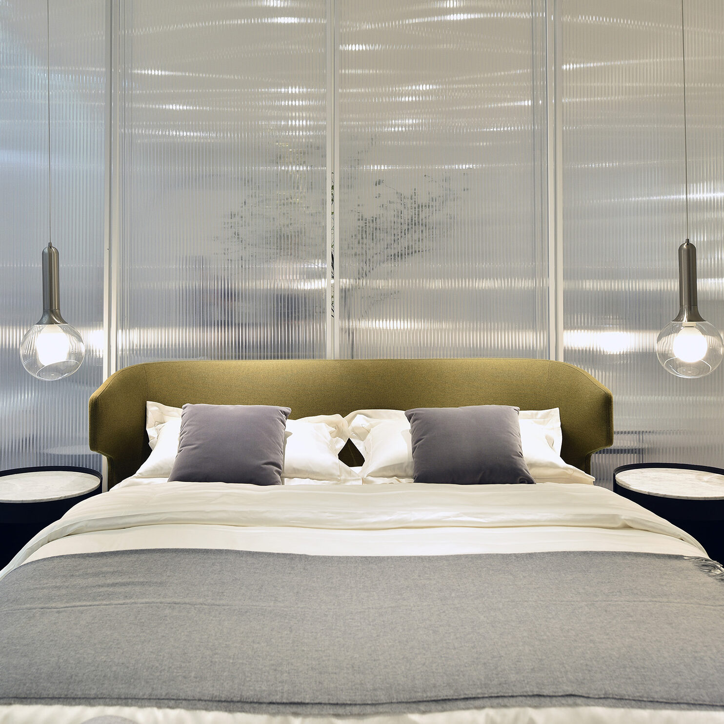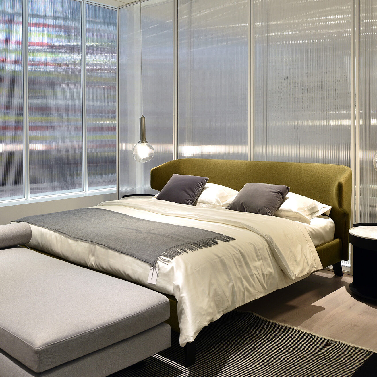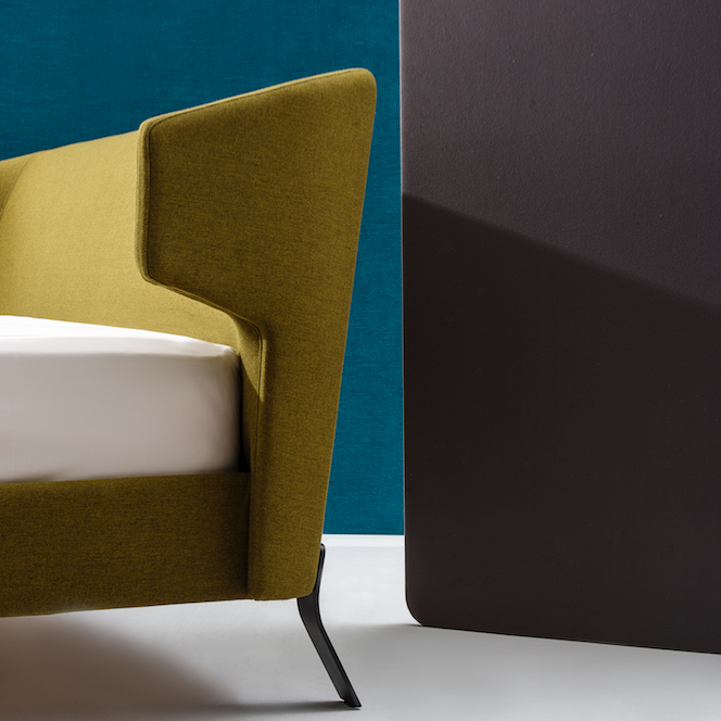 Embrace Bed features a slightly curved headboard in your choice of upholstery. Slender and sleek in silhouette, the Embrace Bed is alluring from every angle. Sleek blackened steel legs are straight and upfront at the foot of the bed, and gently curved at the headboard. Let yourself unwind and unfold with the Embrace series by Camerich.