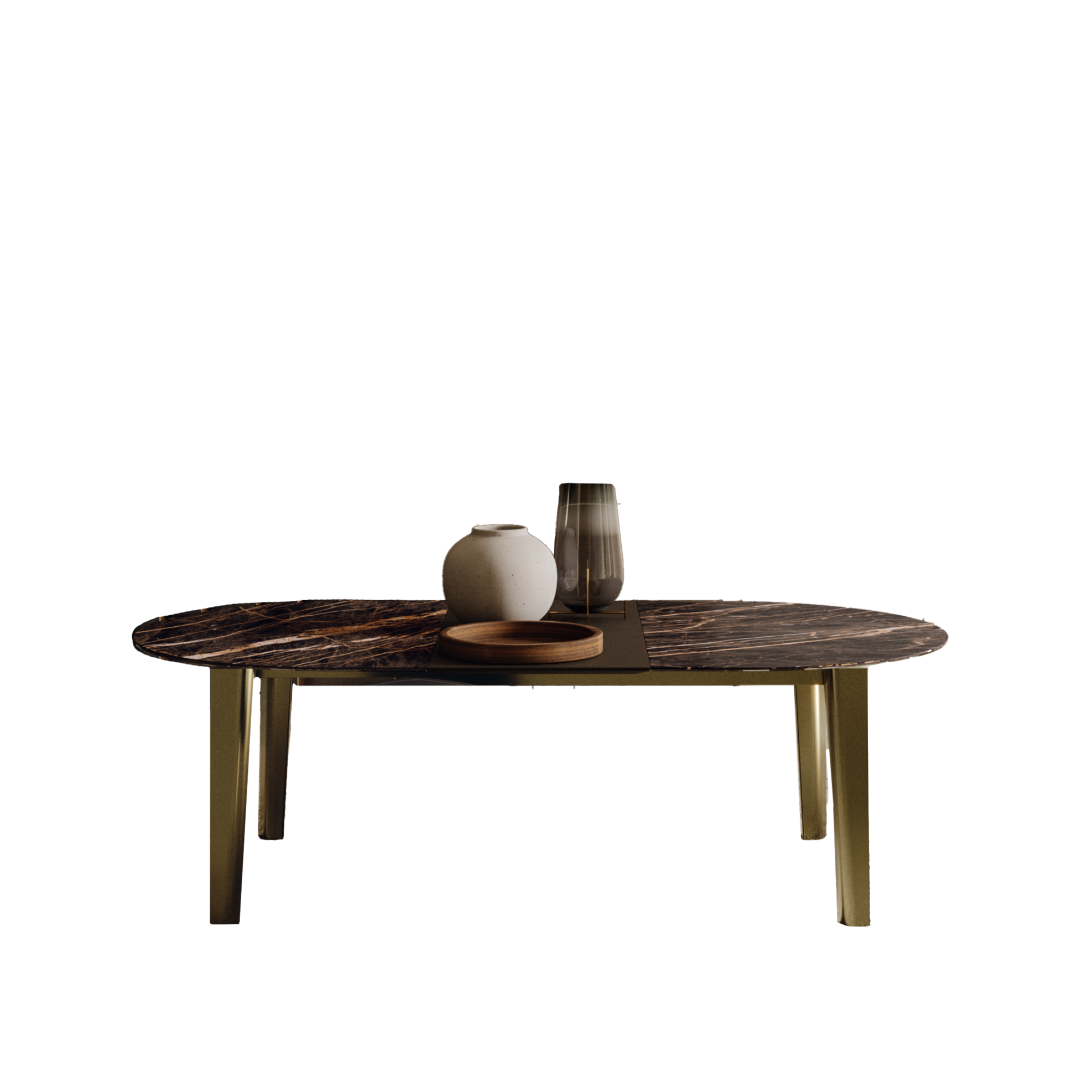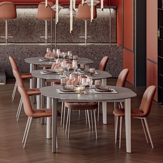 The Etro table honors timeless elegance, where geometry dissolves into curves that gently embrace the surrounding space the legs, with their distinctive, partly rounded shape, challenge traditional concepts, creating a refined pairing with the different top finishes. Available as a fixed non-extension table or with a center butterfly leaf which expands seating from 8 to 10. Matching, melamine, self-storing leaves are available for a seamless look whether open or closed. Glass, SuperCeramic and SuperMarble tops are paired with a complimentary matt lacquered wood for ease of opening the heavier material.