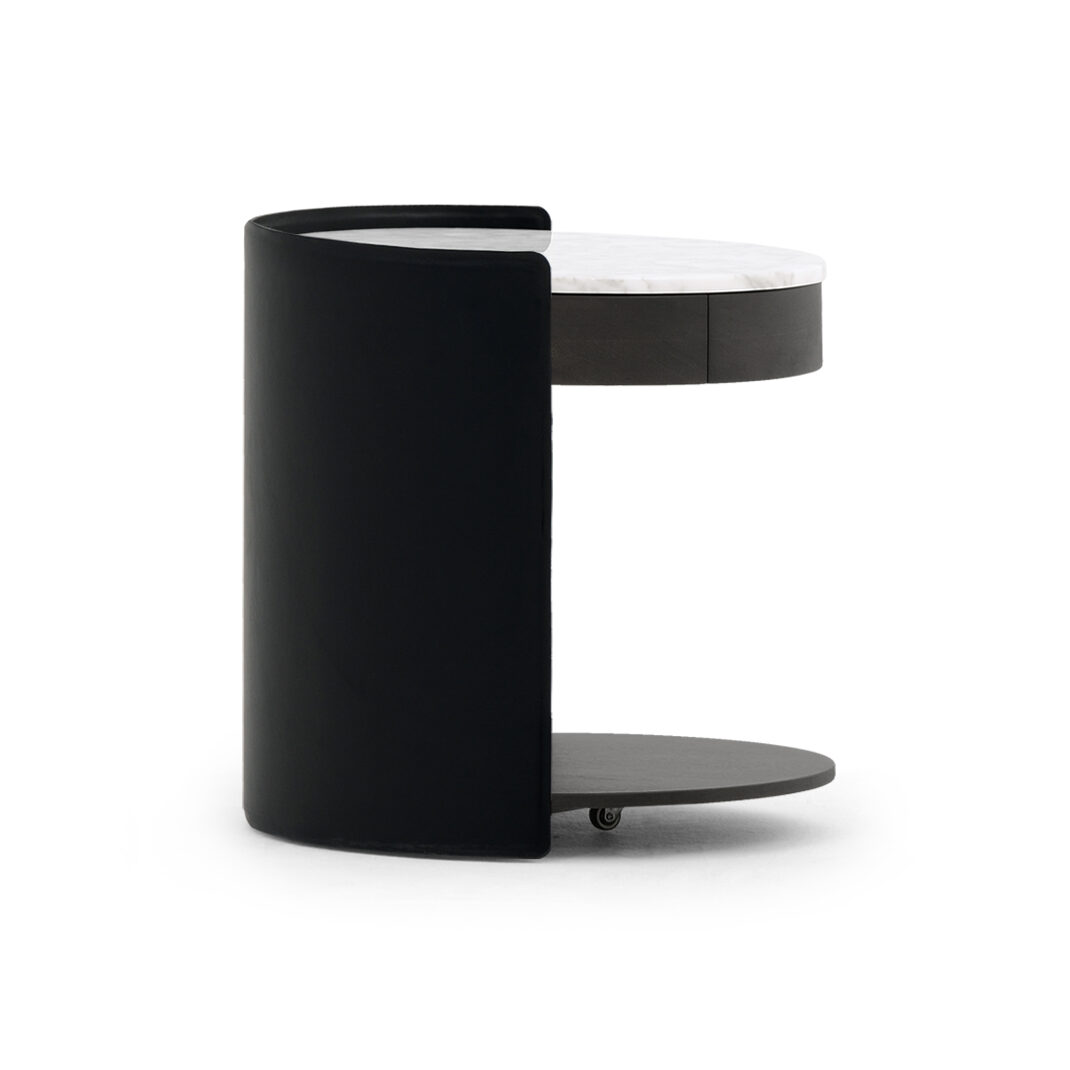 Harmon Nightstand is exquisite to the last detail. Part of Camerich’s Harmon collection, this petite side table or nightstand is offered with a marble top in your choice of finishes. Harmon is upholstered in your choice of Eco-leather upholstery, and is further optimized with a Black Walnut wood drawer to match the base. Harmon Nightstand rests atop a set of castor wheels for easy maneuverability.