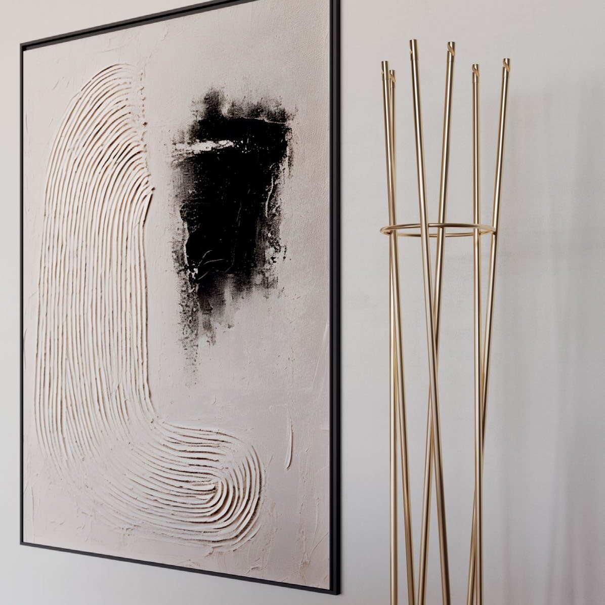 Hula is a freestanding coat hanger with a strong visual impact. A cluster of angled metal rods rises and intersects from a circular base, creating a rhythmic interplay of lines and negative space. The intersecting elements ensure stability and functionality, providing multiple hanging points for garments and accessories, all while maintaining a graphic and contemporary look.