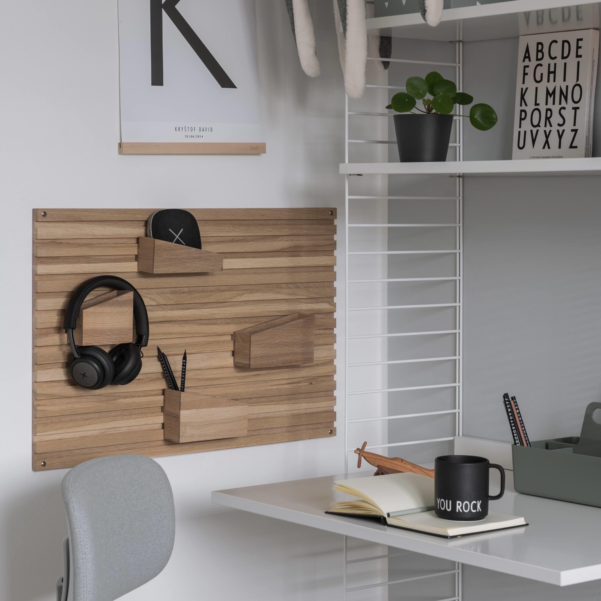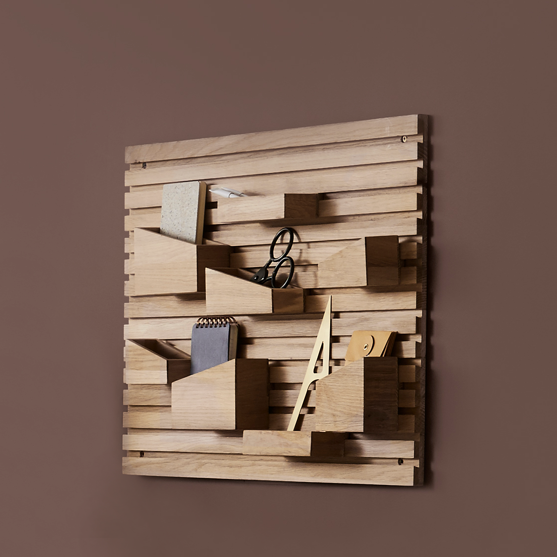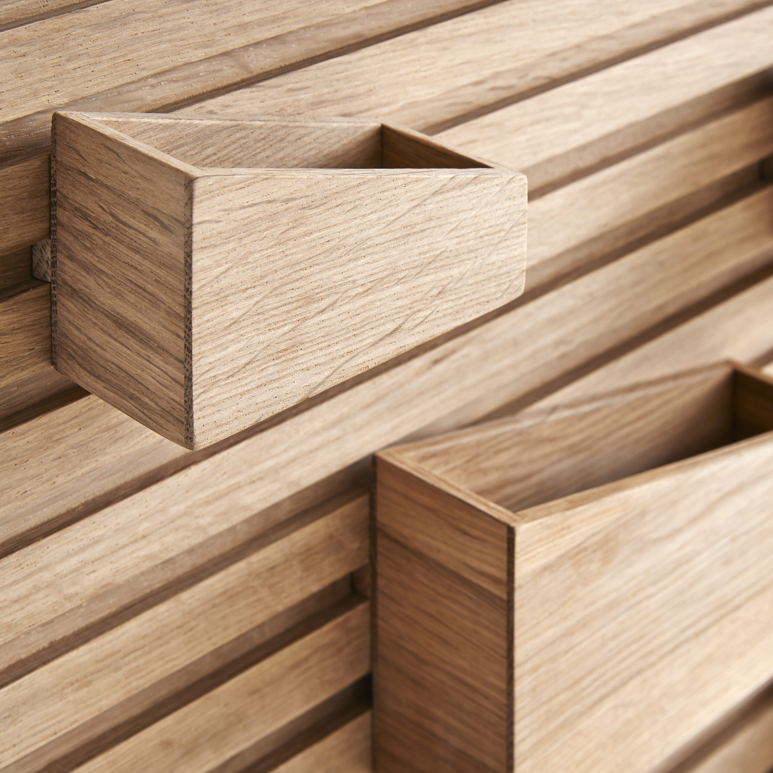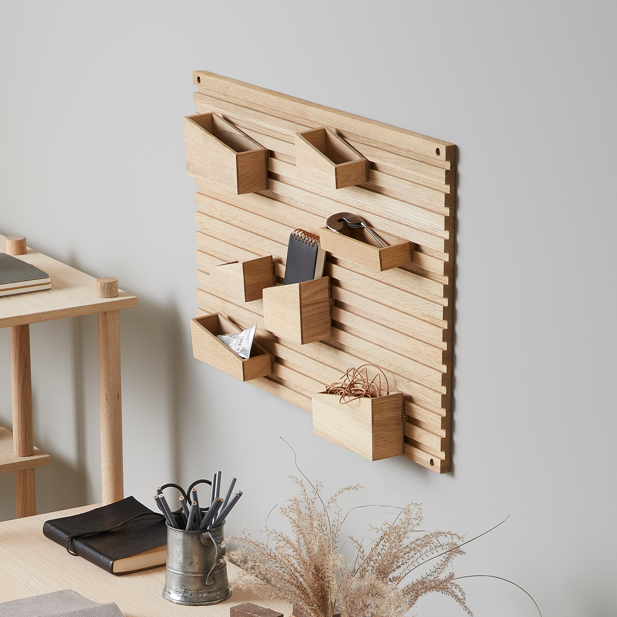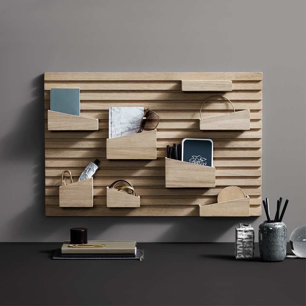Input is a flexible organiser with eight movable boxes in different dimensions and shapes. Allowing you to create the exact expression you want – matching your needs and taste. The softness of the oak complement the graphic and angular lines of the organiser and pockets. The design is a perfect solution to organise small everyday essentials in thehallway, office or bedroom.