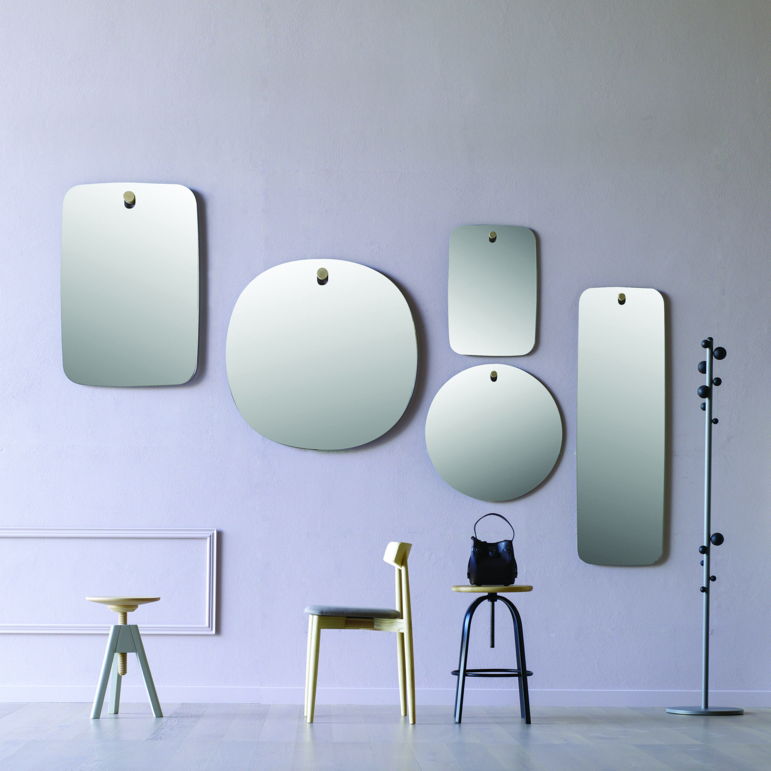 Brothers is a family of rather special mirrors, made up of seven brothers, two large (BIGGER BROTHERS), two intermediate (MIDDLE BROTHERS) and three small (LES BROTHERS). If the two large ones amplify and expand the space, the small ones add sweetness to the environment whilst the mid-sized ones seek a dialogue between the two functions. They share a small beauty spot on the upper part, a detail in wood that also acts as the wall mount.