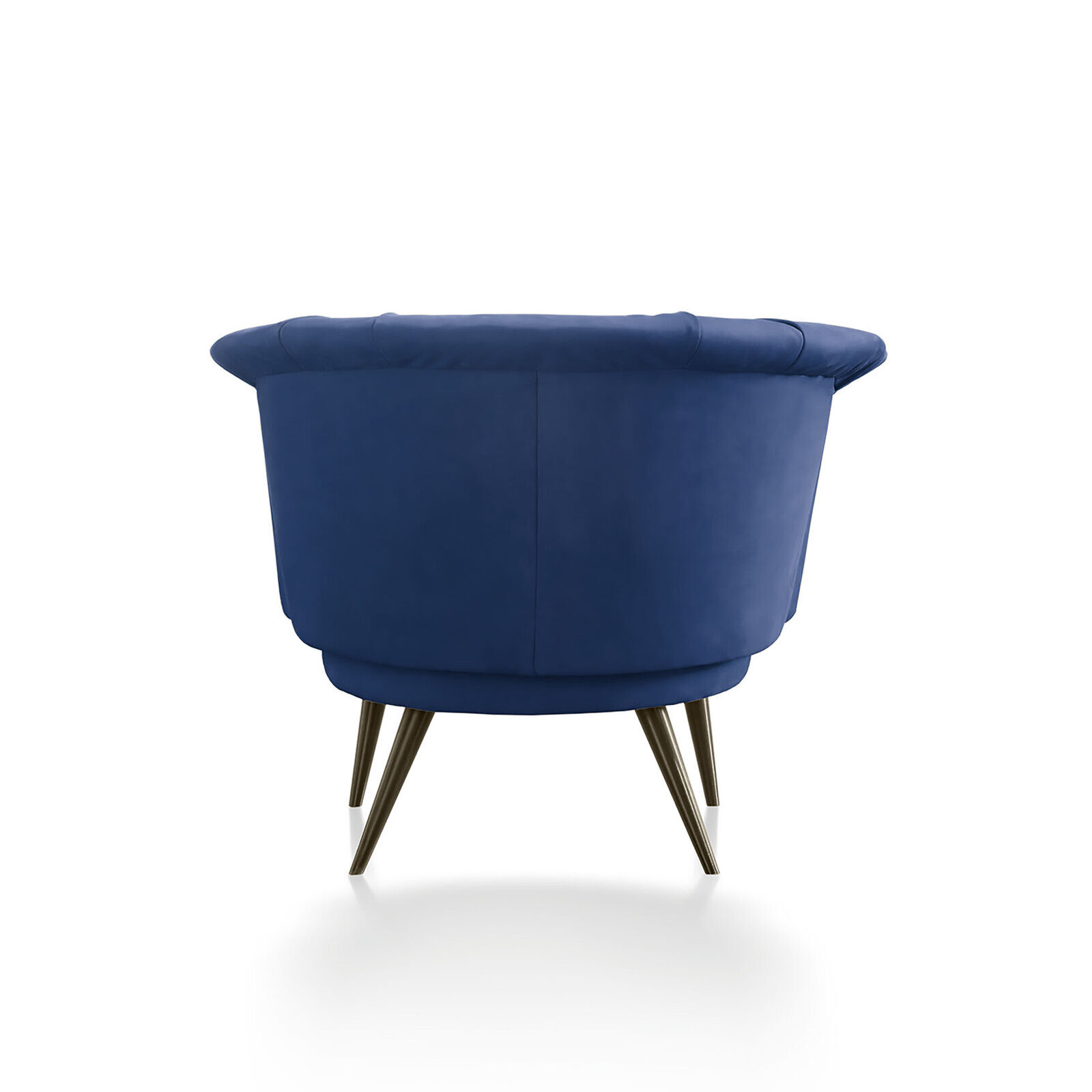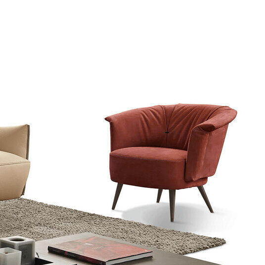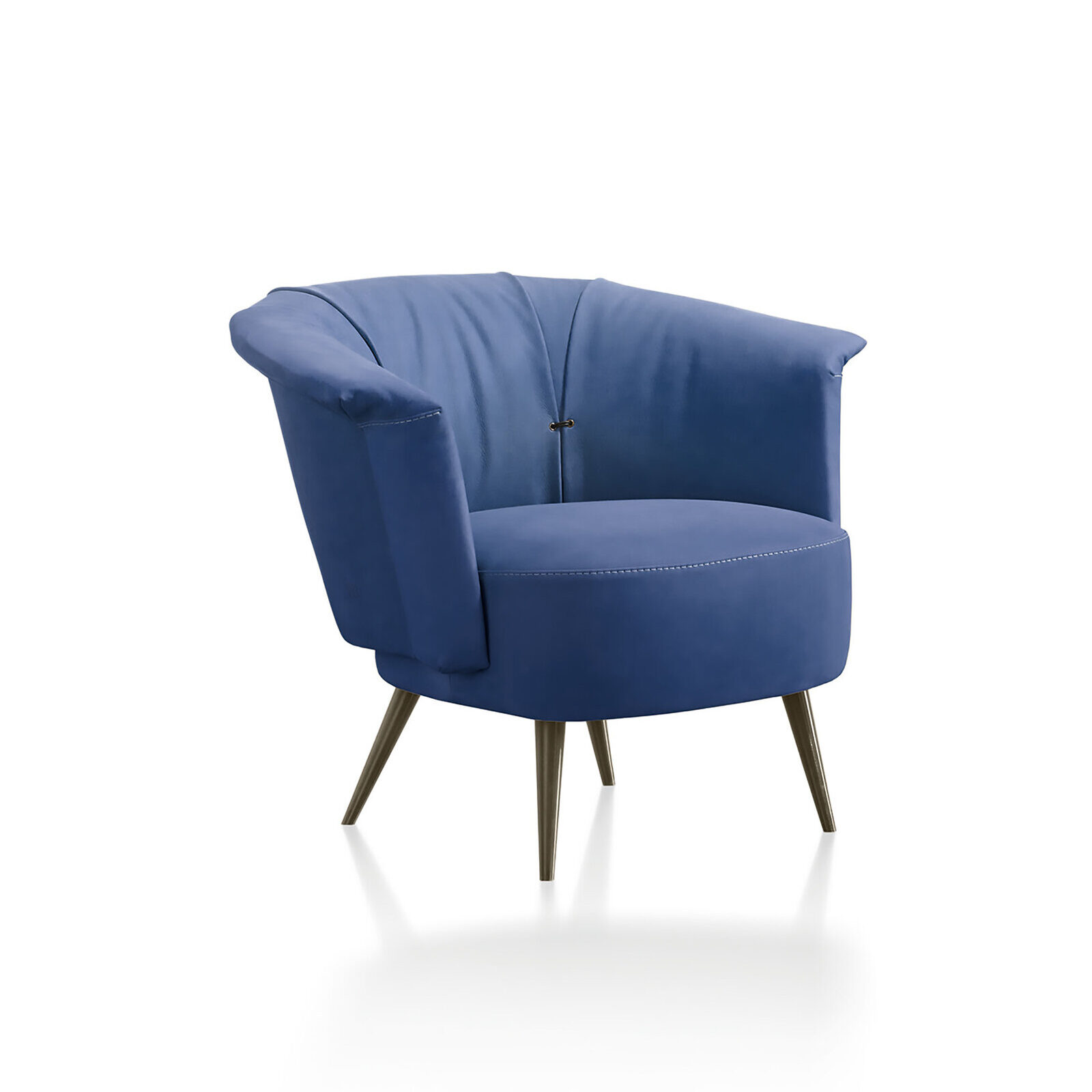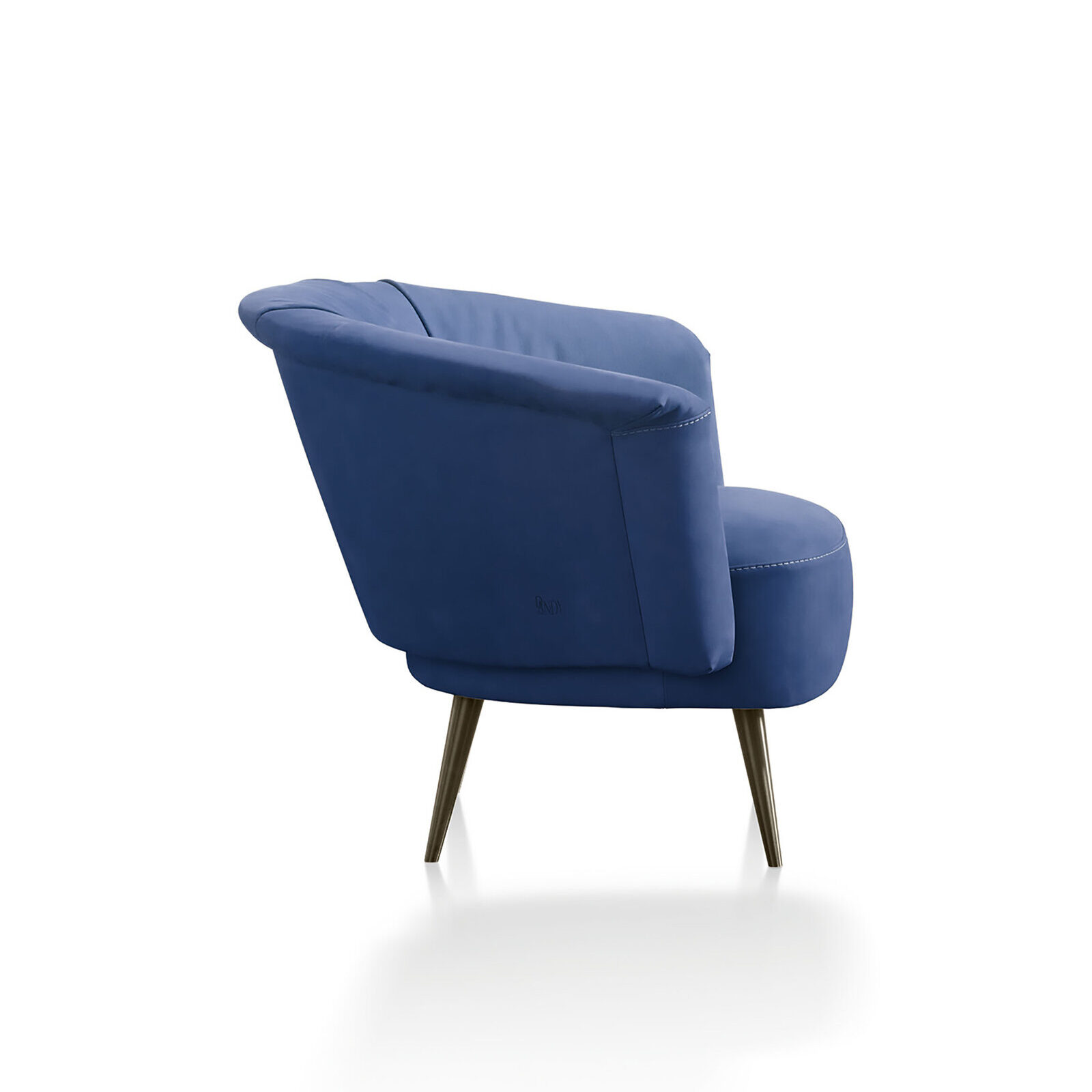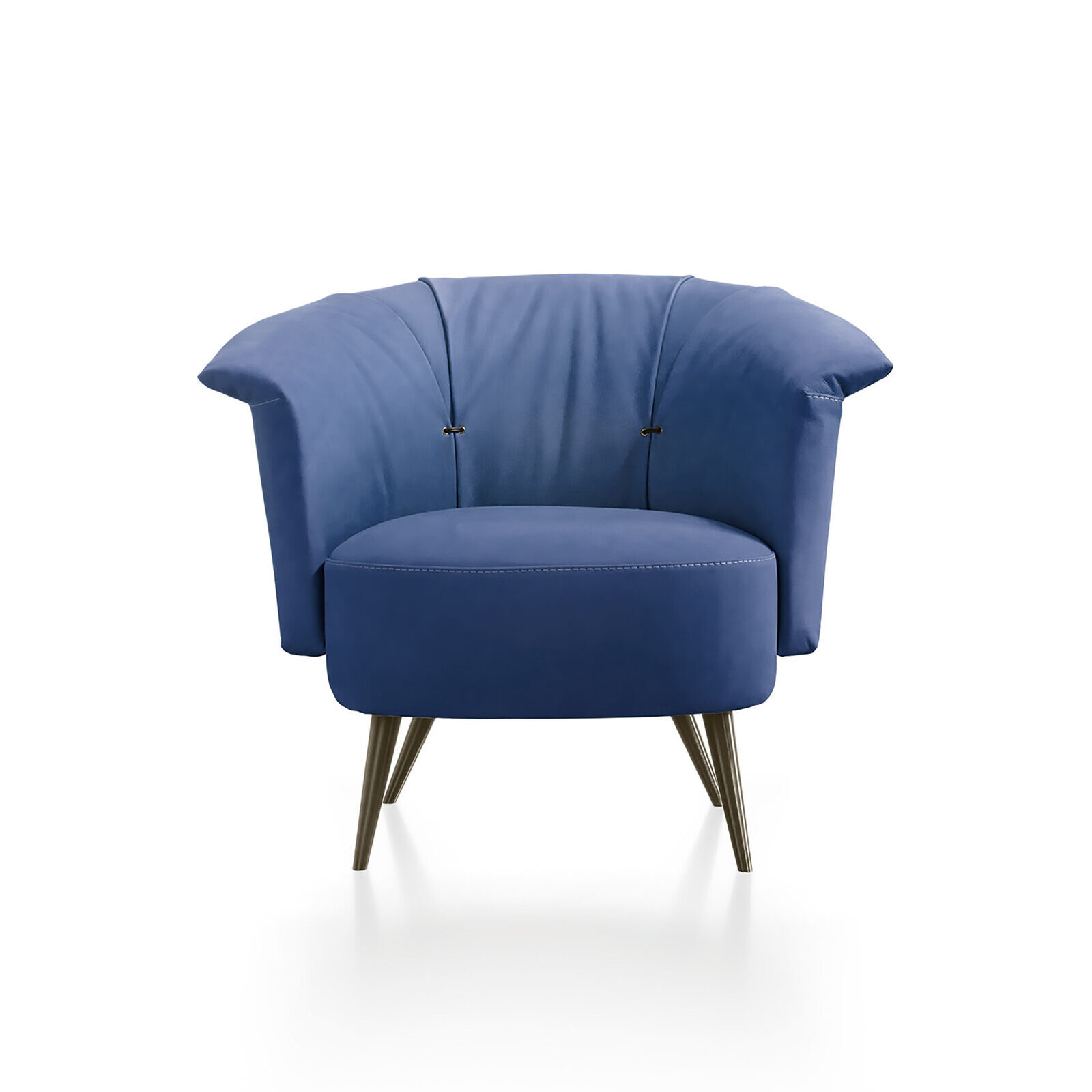 Leather armchair “Luna” means “Moon” in Italian. It evokes curves and a rounded silhouette, recalling the different phases of the moon depending on where your gaze falls. The leather armchair Luna offers supreme comfort and soft curves with its wide backrest. One sharp detail is the Caucciu tie adorning the back of the chair; the tie is pulled through a metal eyelet available in a finish that matches the base.