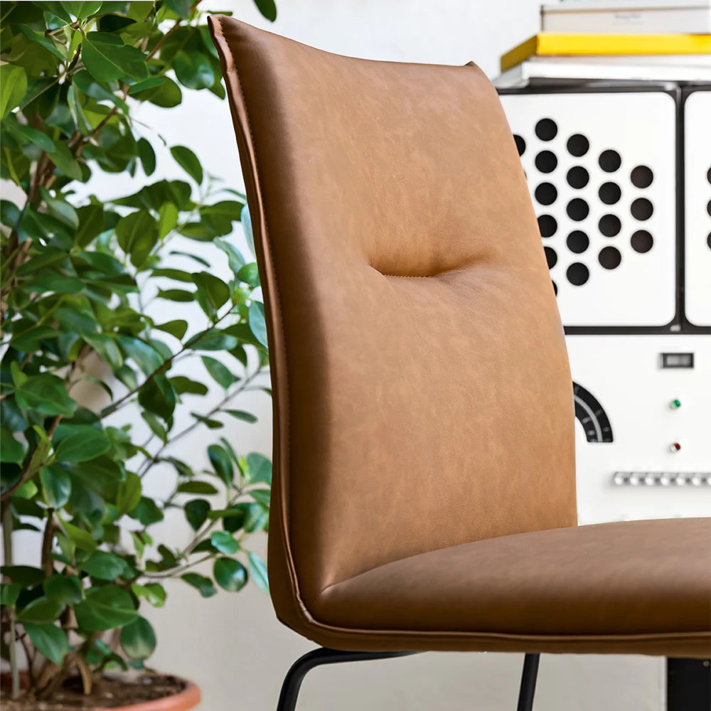 MAYA is a functional and elegant chair. It has a 14mm diameter tubular metal frame and a fabric seat shell. It features a pinched seam detailing along the sides and a decorative horizontal fabric fell on the backrest.