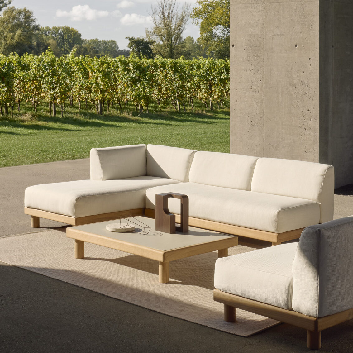 Combining elegance and sleek lines in a relaxed silhouette, the Monocle feels refined, inviting and grounded. The Monocle coffee table’s smooth form offers a practical surface for outdoor lounging, keeping everything within easy reach while complementing the sofa’s curves.
