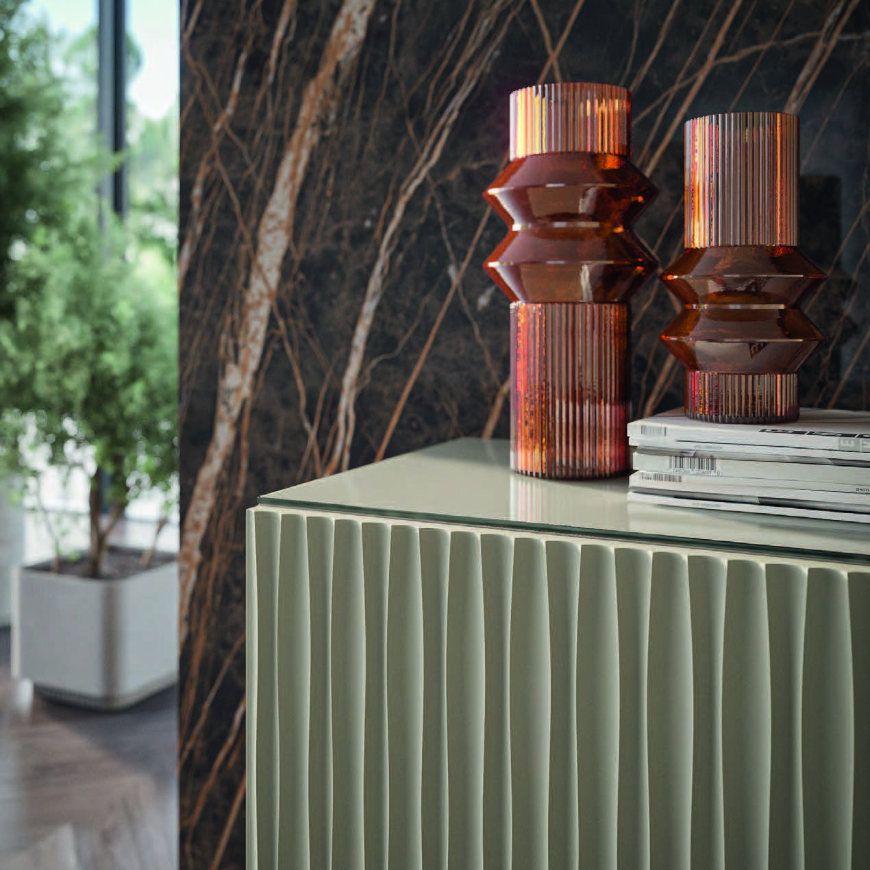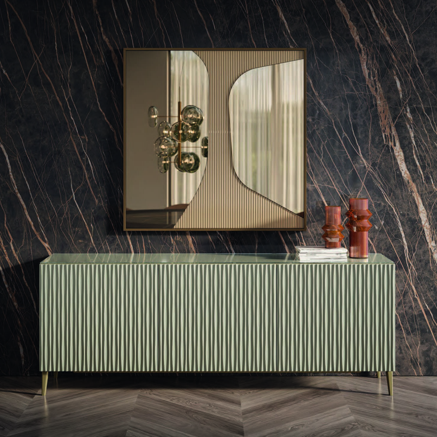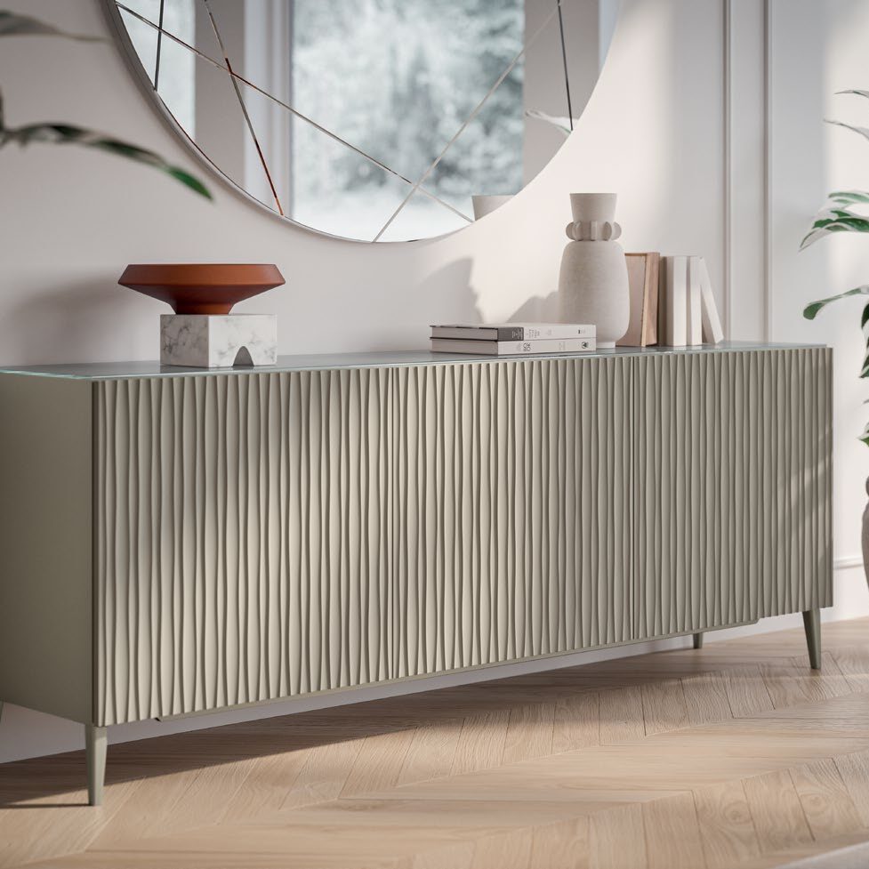 The Musa buffet is the cutting-edge interpretation of the naturalness and versatility of wood. It is the encounter between traditional craftsmanship and modern design. The texture of the doors – crossed by delicate vertical grooves following precise and harmonious rhythm – creates a dance of light and shadow transforming the solid material into a fluid and dynamic sensory experience.