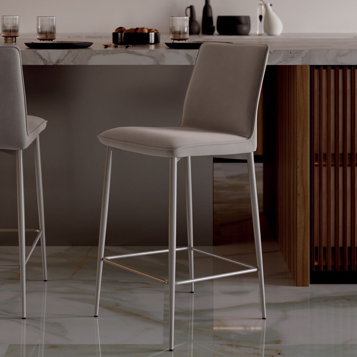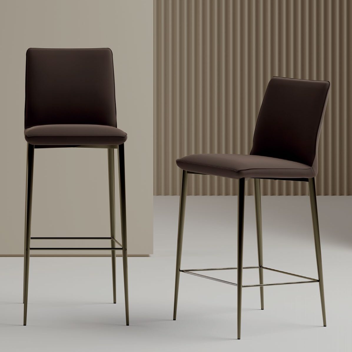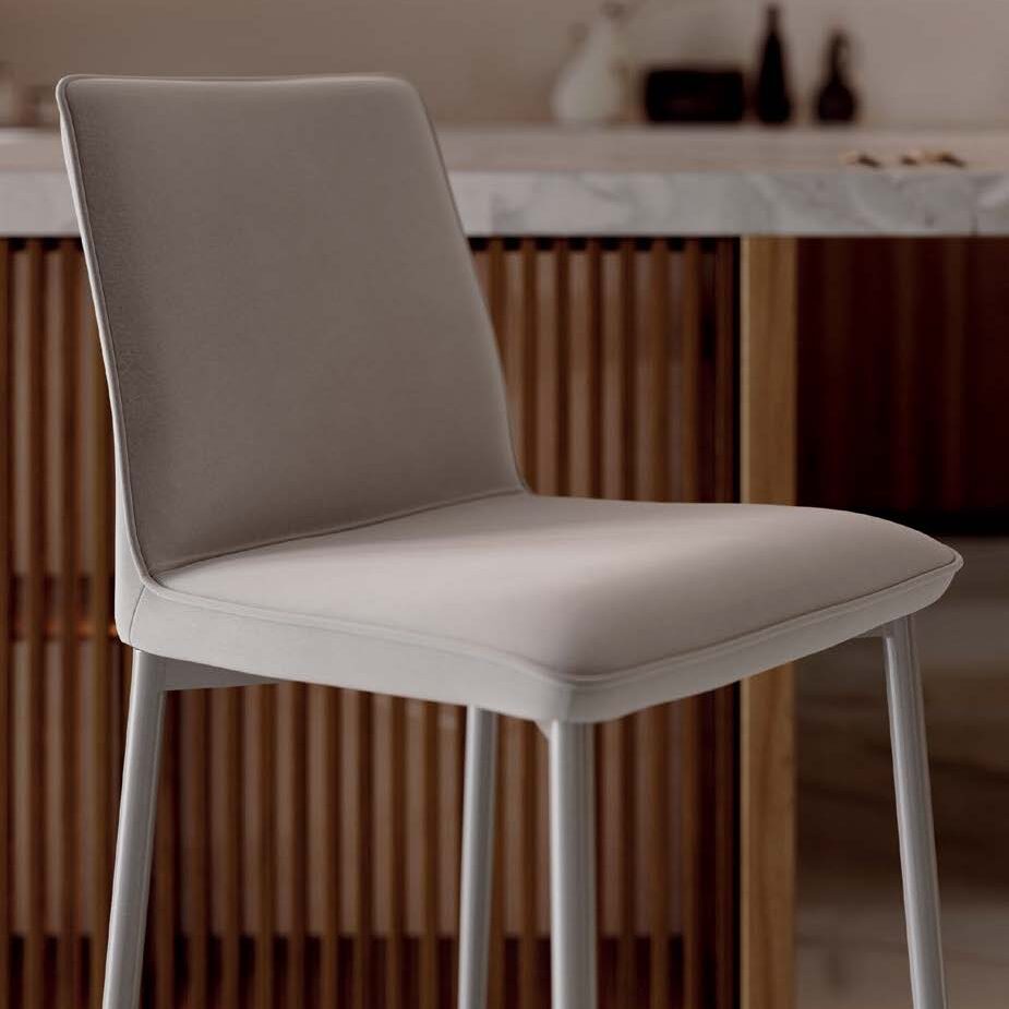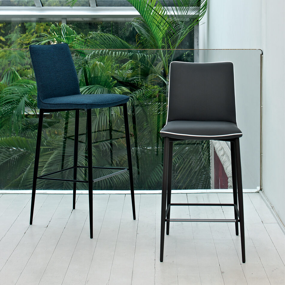 The Nata stool, with its slim profile and compact form, fits elegantly into modern interiors, from home kitchens to hotel lobbies. The upholstered seat and ergonomic backrest offer a surprisingly comfortable experience, while maintaining a light, clean look. It is available in two styles: a four-legged steel base with a sleek, technical design, or a central gas-lift swivel base with adjustable height. Optional quilting on the back of the seat adds a tailored touch, elevating the simplicity of the design with a refined detail.