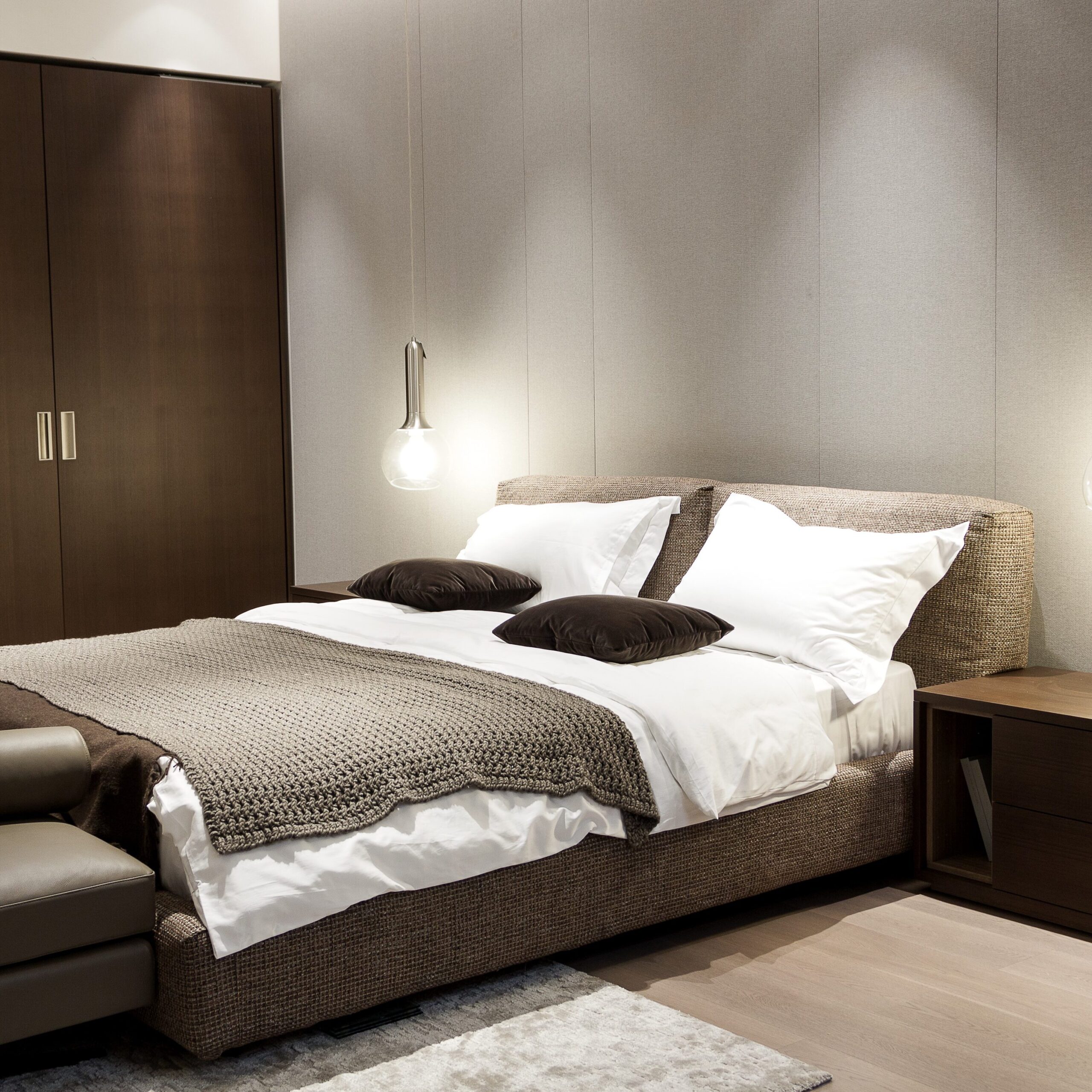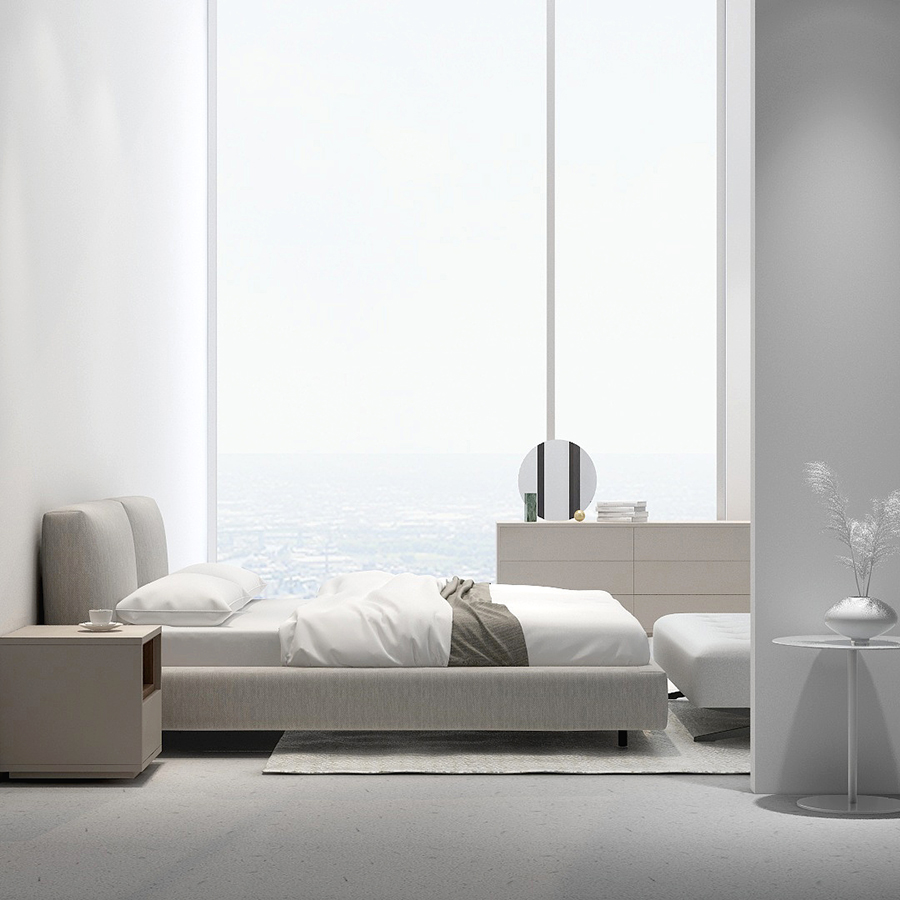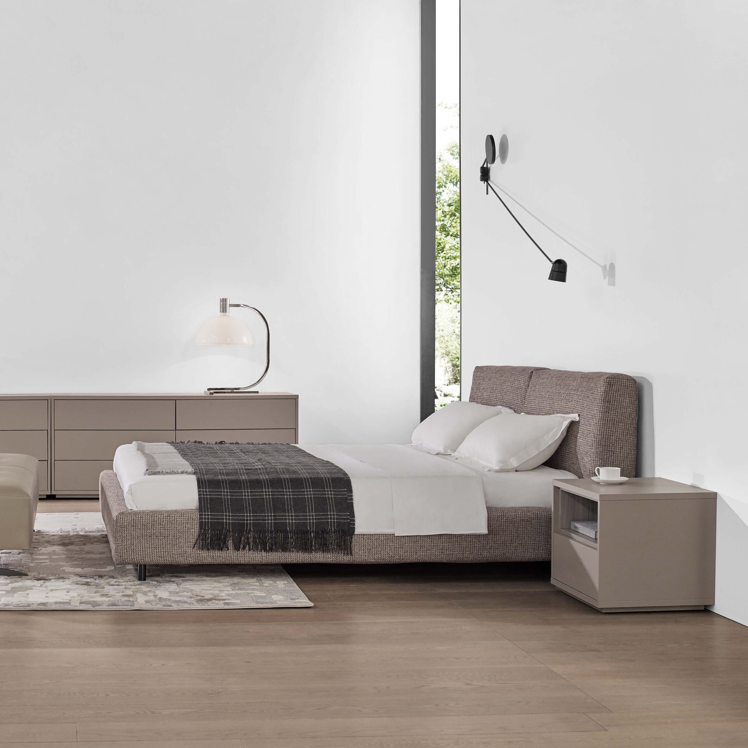 The Nature Bed is irresistible with its fully upholstered design and low profile approach. Style and substance come together in Nature’s down-topped headboard cushioning, evoking an ambience of softness. Sturdy, anodized black metal legs support the whole design. Customize the Nature bed with your choice of leather or fabric upholstery.