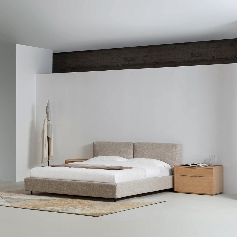 The Nature Bed is irresistible with its fully upholstered design and low profile approach. Style and substance come together in Nature’s down-topped headboard cushioning, evoking an ambience of softness. Sturdy, anodized black metal legs support the whole design. Customize the Nature bed with your choice of leather or fabric upholstery.