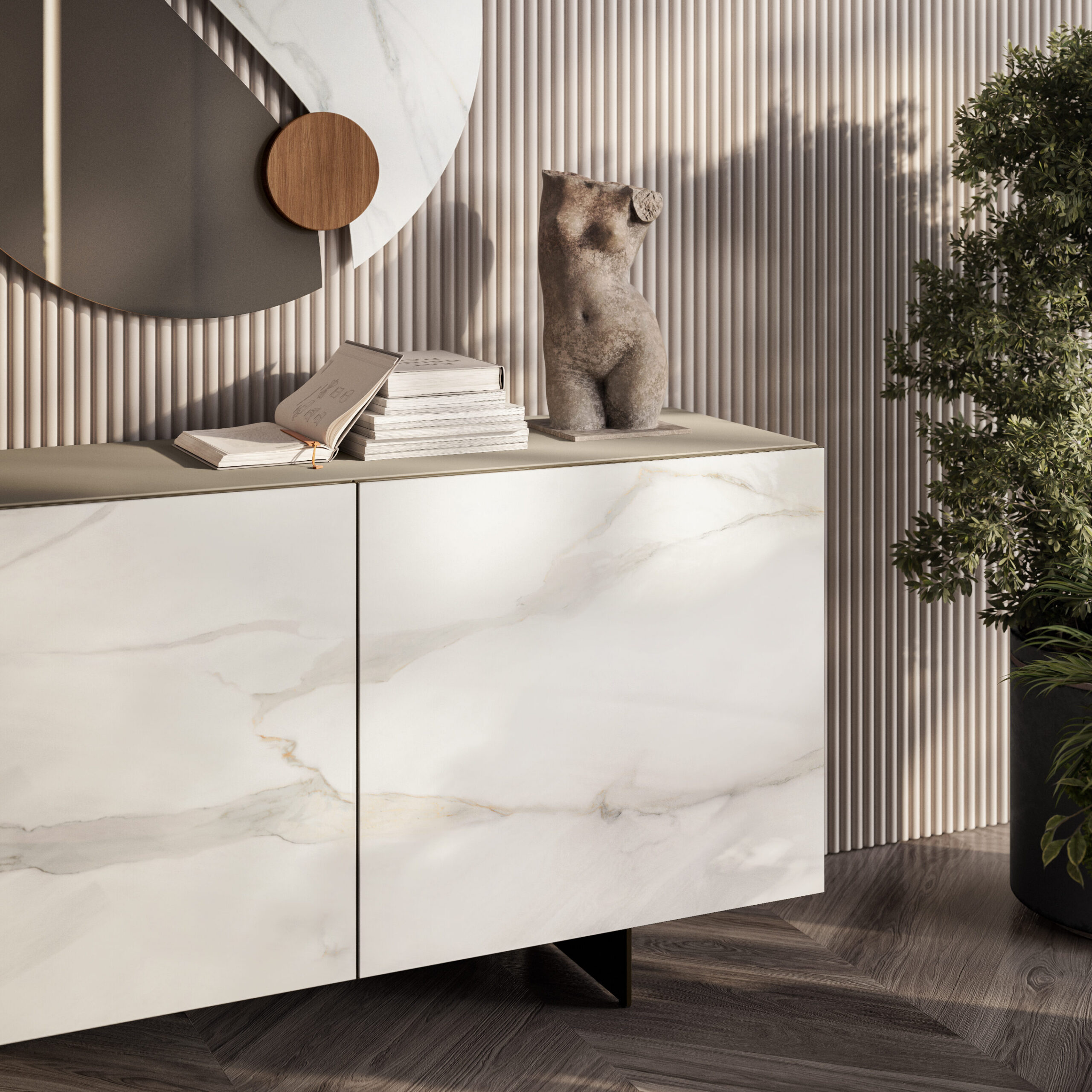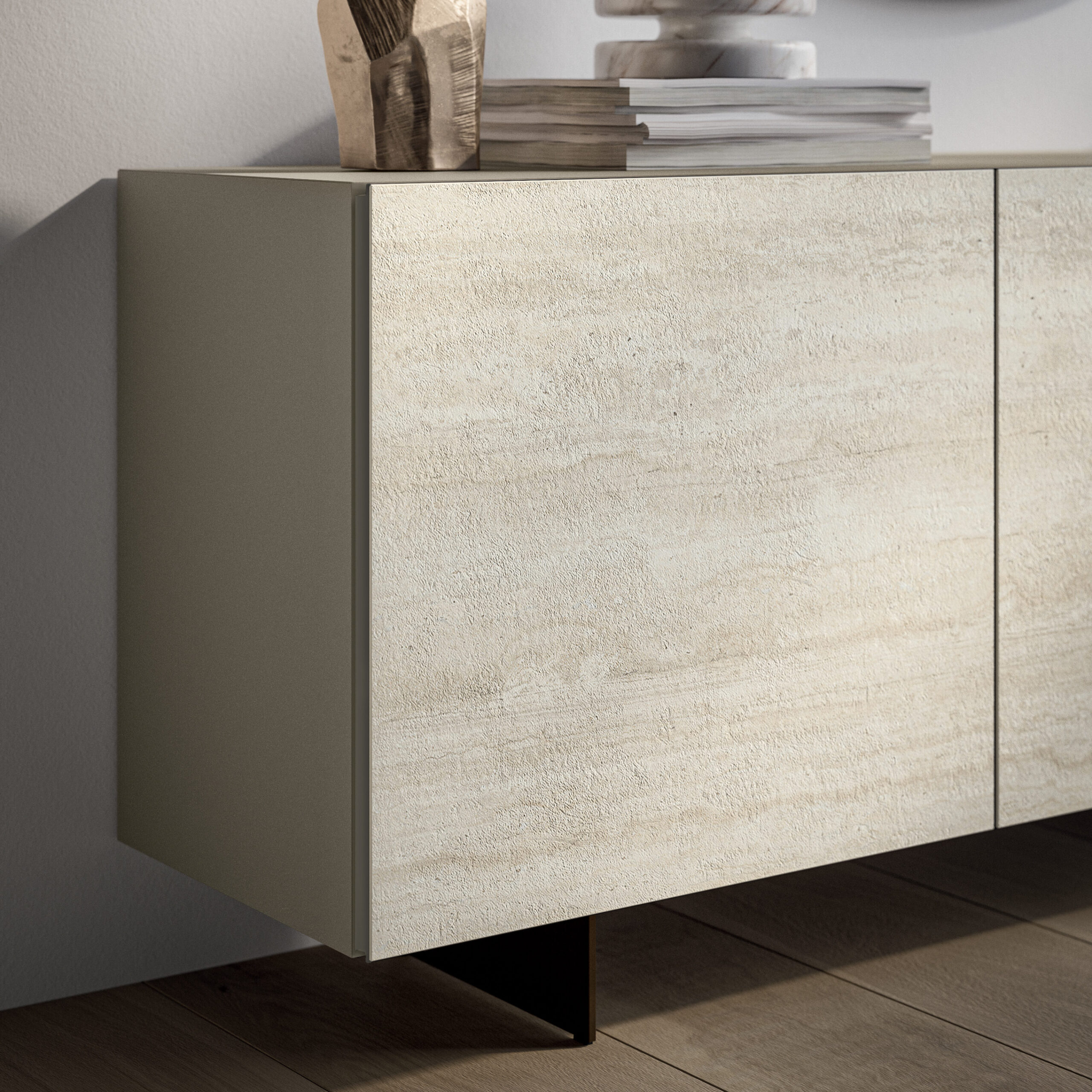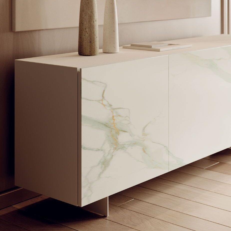 The Olympia buffet is characterized by a sculptural and minimalist elegance, celebrating contemporary design through a refined combination of innovative materials and sophisticated textures. The structure, with three hinged doors, defines a monolithic and refined volume. The sides and top continue the linearity of the design, while the interior glass shelves lighten the composition while providing organization. Available on a solid plinth base or raised on legs in various metallic finishes. Optimize your storage further with an optional mirrored interior drawer.