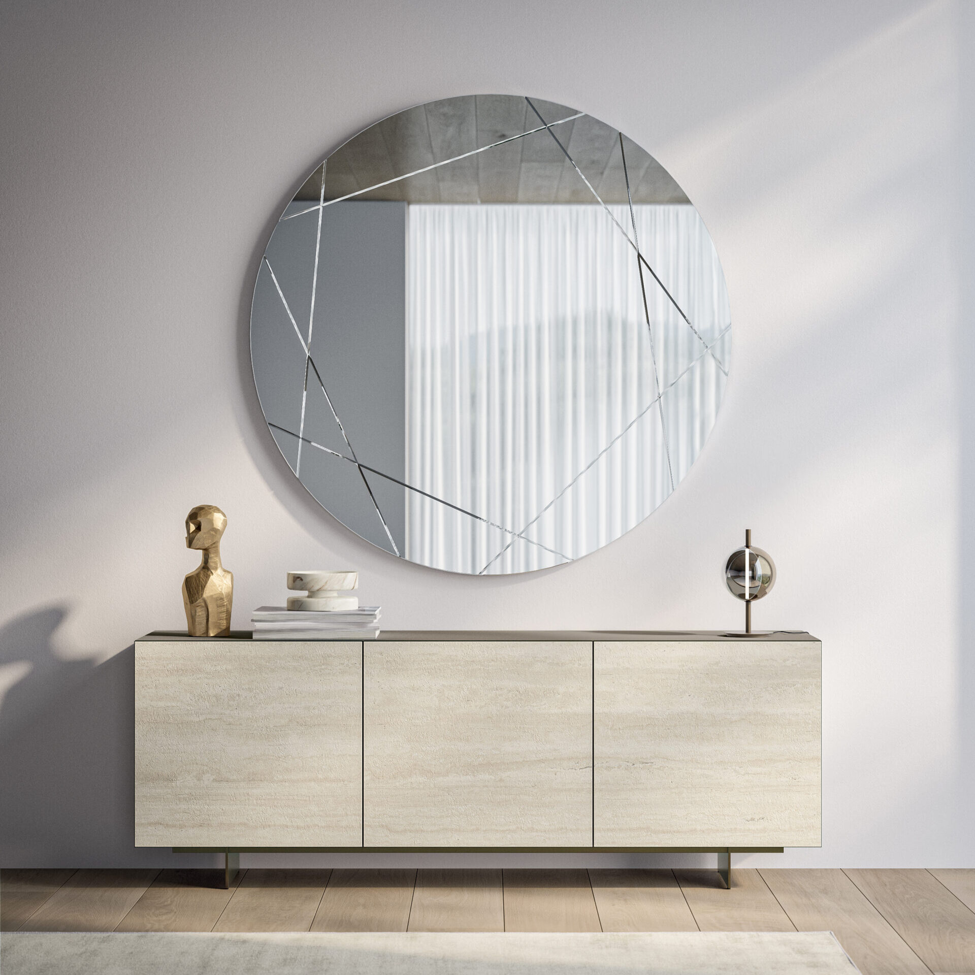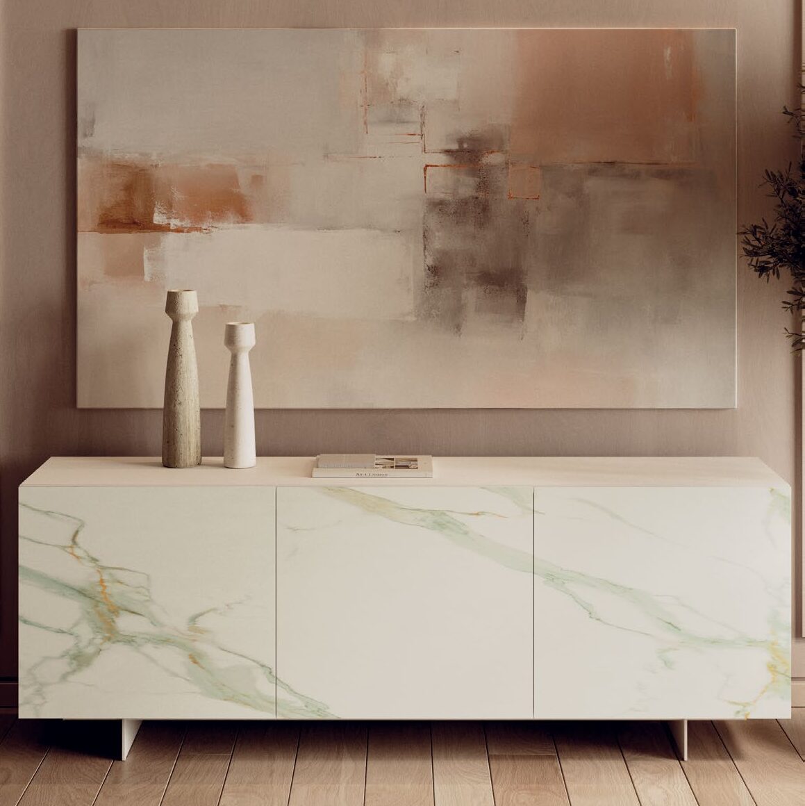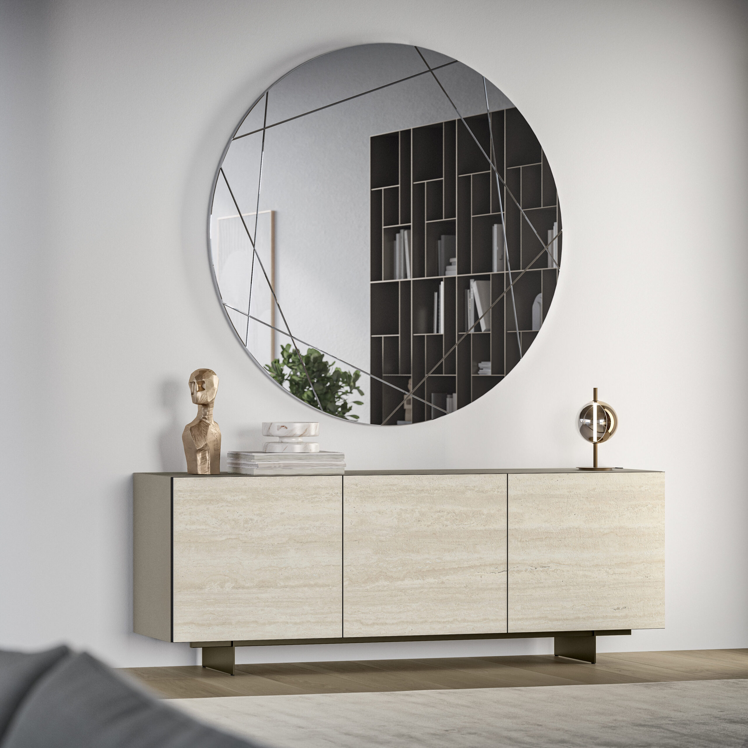 The Olympia buffet is characterized by a sculptural and minimalist elegance, celebrating contemporary design through a refined combination of innovative materials and sophisticated textures. The structure, with three hinged doors, defines a monolithic and refined volume. The sides and top continue the linearity of the design, while the interior glass shelves lighten the composition while providing organization. Available on a solid plinth base or raised on legs in various metallic finishes. Optimize your storage further with an optional mirrored interior drawer.