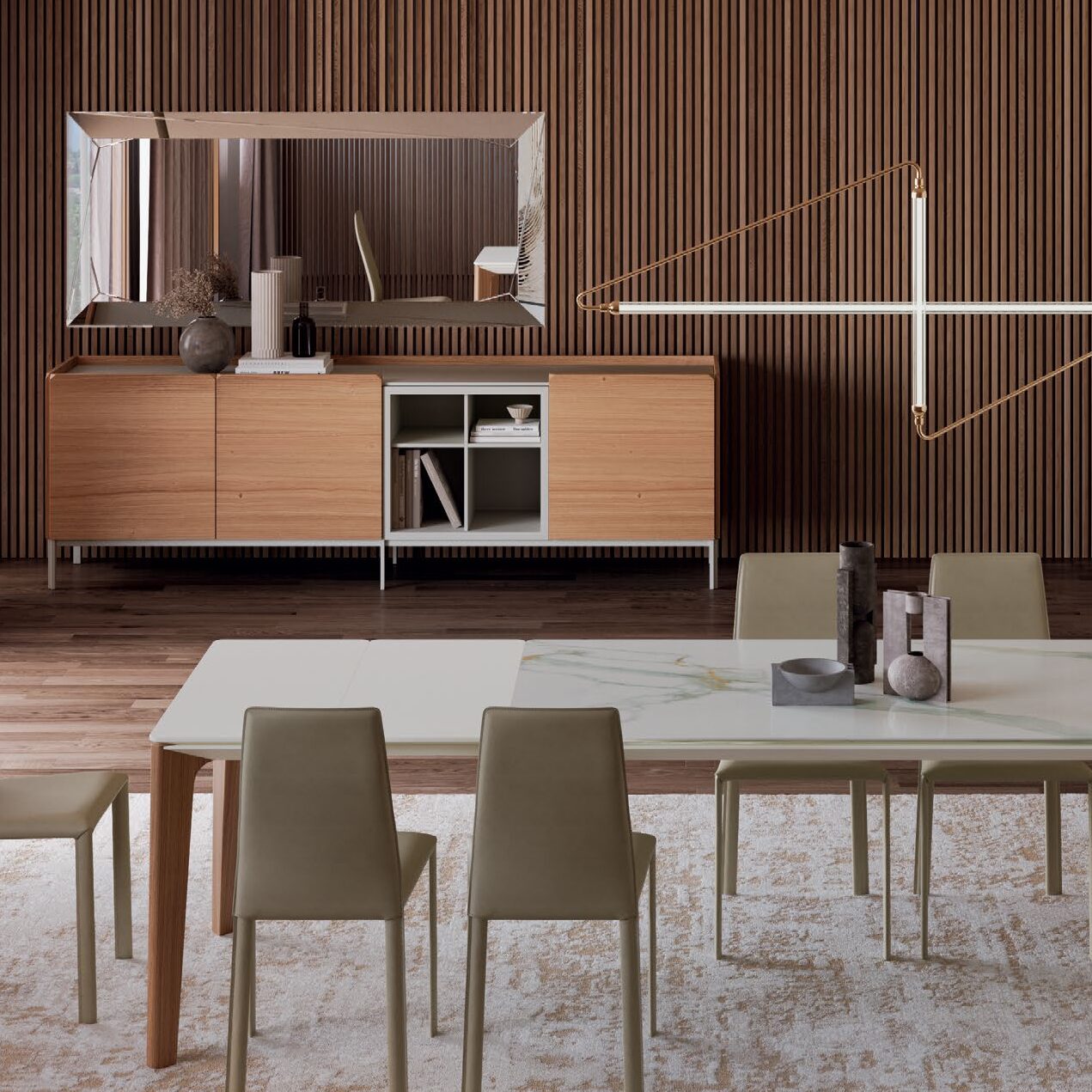 Pica Buffet shines with its smooth wood doors and crisp modern lines. This veneered wooden sideboard is available with a variety of Bontempi’s lovely top options in glass, wood or ceramics. The hinged doors open up to clear glass shelves, with the sideboard resting on lacquered metal feet. Choose from several configurations to finish Pica, as well as further embellishments including mirrored glass drawers and a matching lacquered tray.