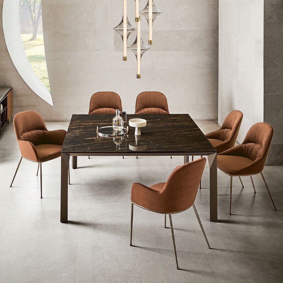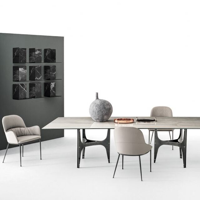 The Queen chair is an icon of comfort and style, combining the elegance of contemporary design with a strong, distinctive presence. Spacious and enveloping, it offers the comfort of a lounge chair while providing support and height for everyday dining. The lacquered steel base adds an industrial-chic touch, while the solid wood version expresses a natural warmth. Two complementary versions catering to different needs of space and style. Available with or without arms as well as in counter stool height.