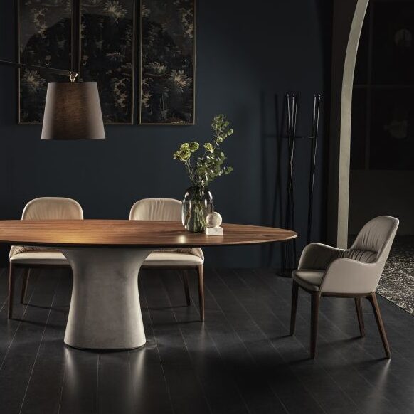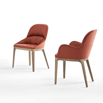 The Queen chair is an icon of comfort and style, combining the elegance of contemporary design with a strong, distinctive presence. Spacious and enveloping, it offers the comfort of a lounge chair while providing support and height for everyday dining. The lacquered steel base adds an industrial-chic touch, while the solid wood version expresses a natural warmth. Two complementary versions catering to different needs of space and style. Available with or without arms as well as in counter stool height.