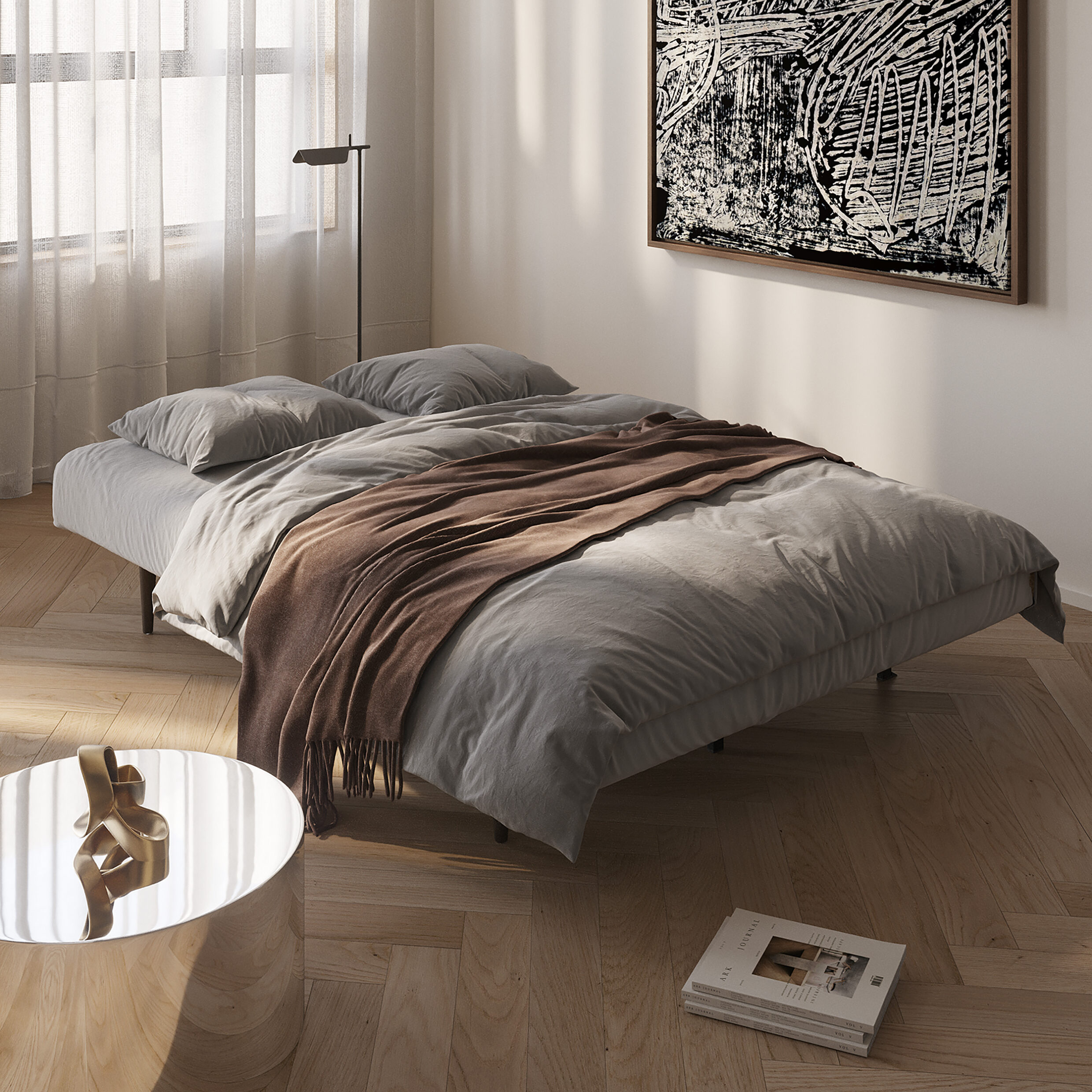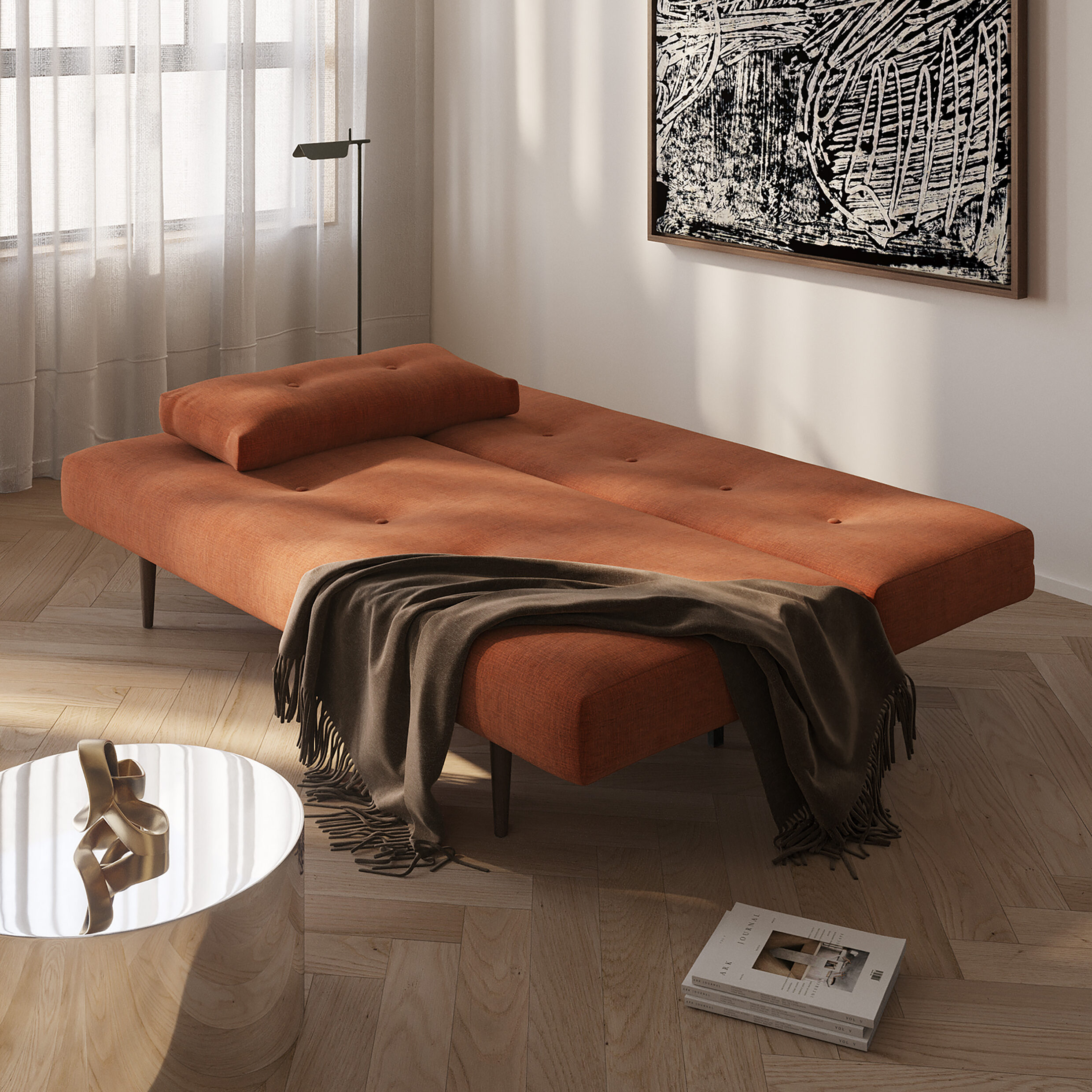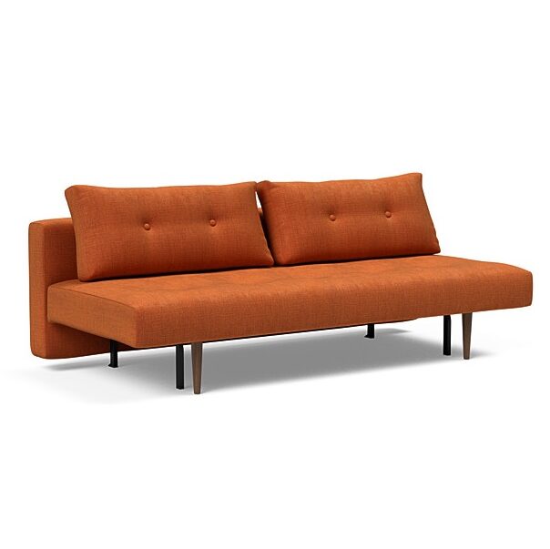 Recast Plus Sleeper Sofa is an aesthetically pleasing design by Innovation which is certain to impress with its space-saving comfort and unique personality. With Recast’s clear Mid-century modern design influence, its key characteristics are its slightly rounded edges in combination with a classic use of buttons and dark stained wood legs. Remove the Recast cushions and you have a single bed. Slide out the seat, flip down the backrest and you now have a bed perfect for two to sleep in style.