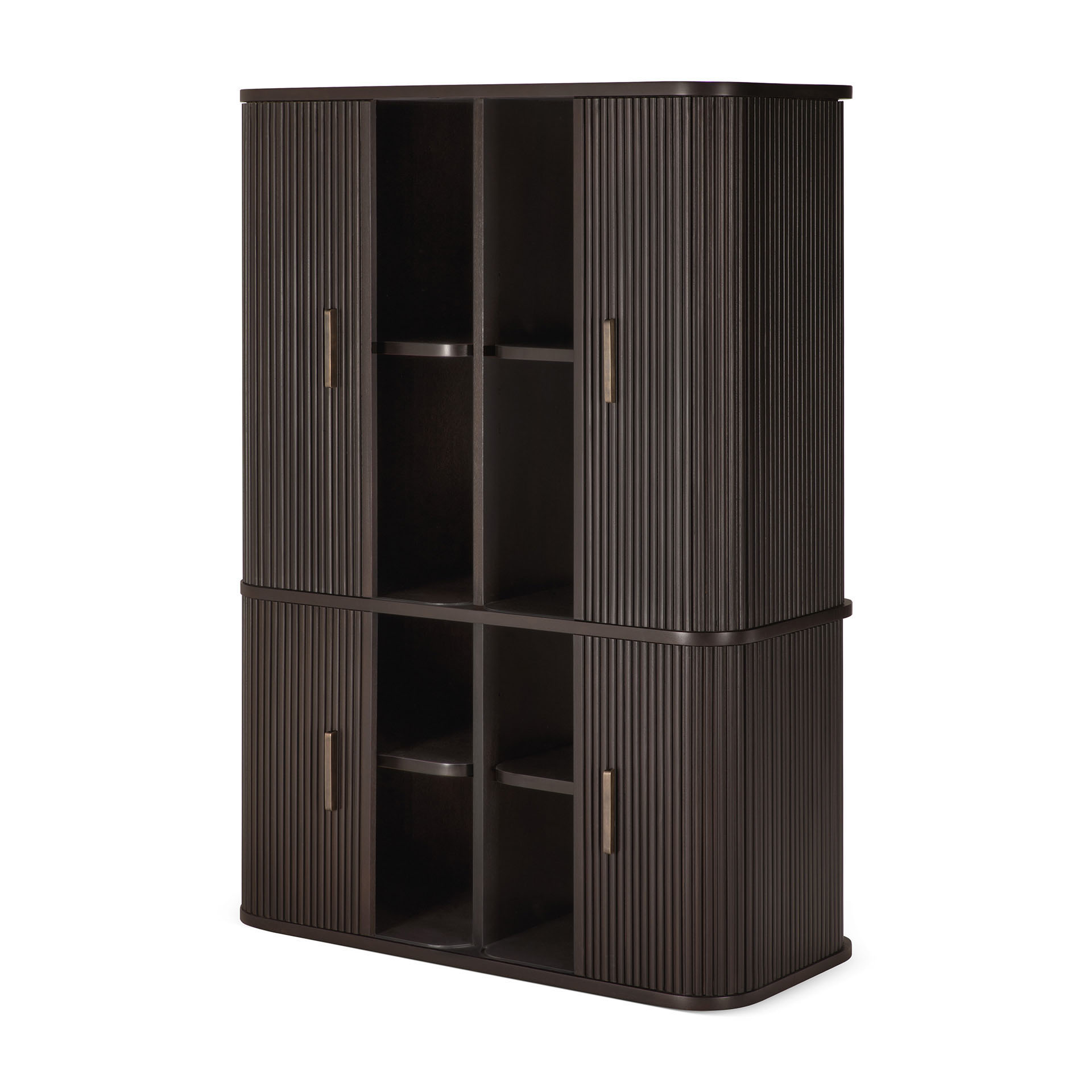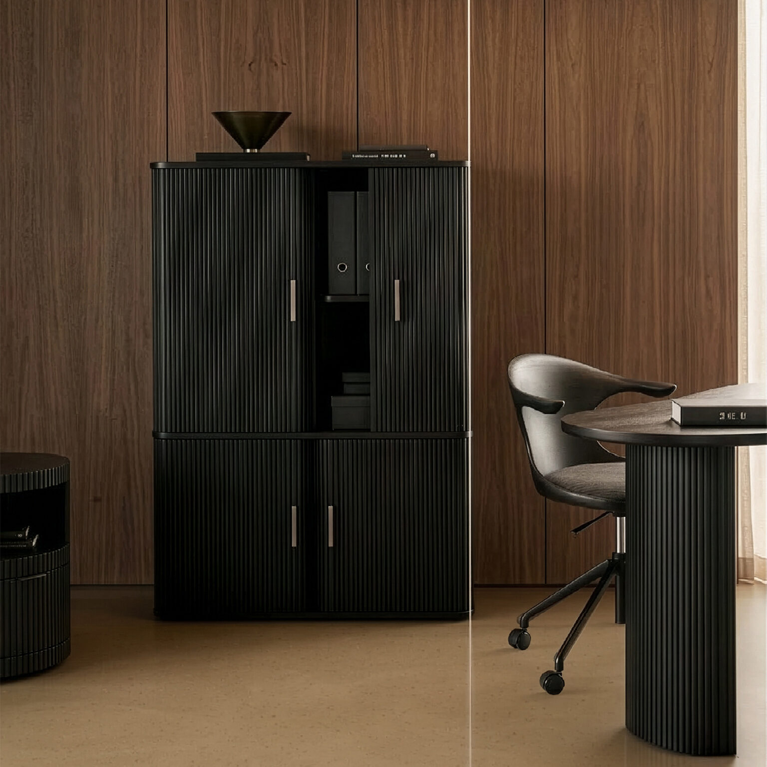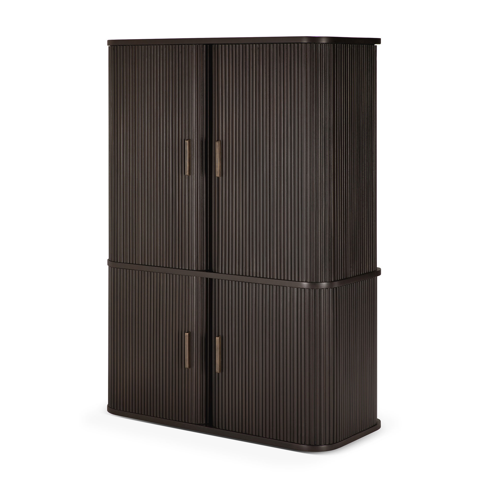 The Roller Max filing cabinet offers functional storage with a distinctive presence. Featuring sliding doors, adjustable shelving and seamlessly integrated handles, it beautifully showcases the collection’s stacked wood-stick pattern. A refined filing solution suited to line a wall or define a space, it brings considered organisation to evolving office environments. Designed by Alain van Havre.