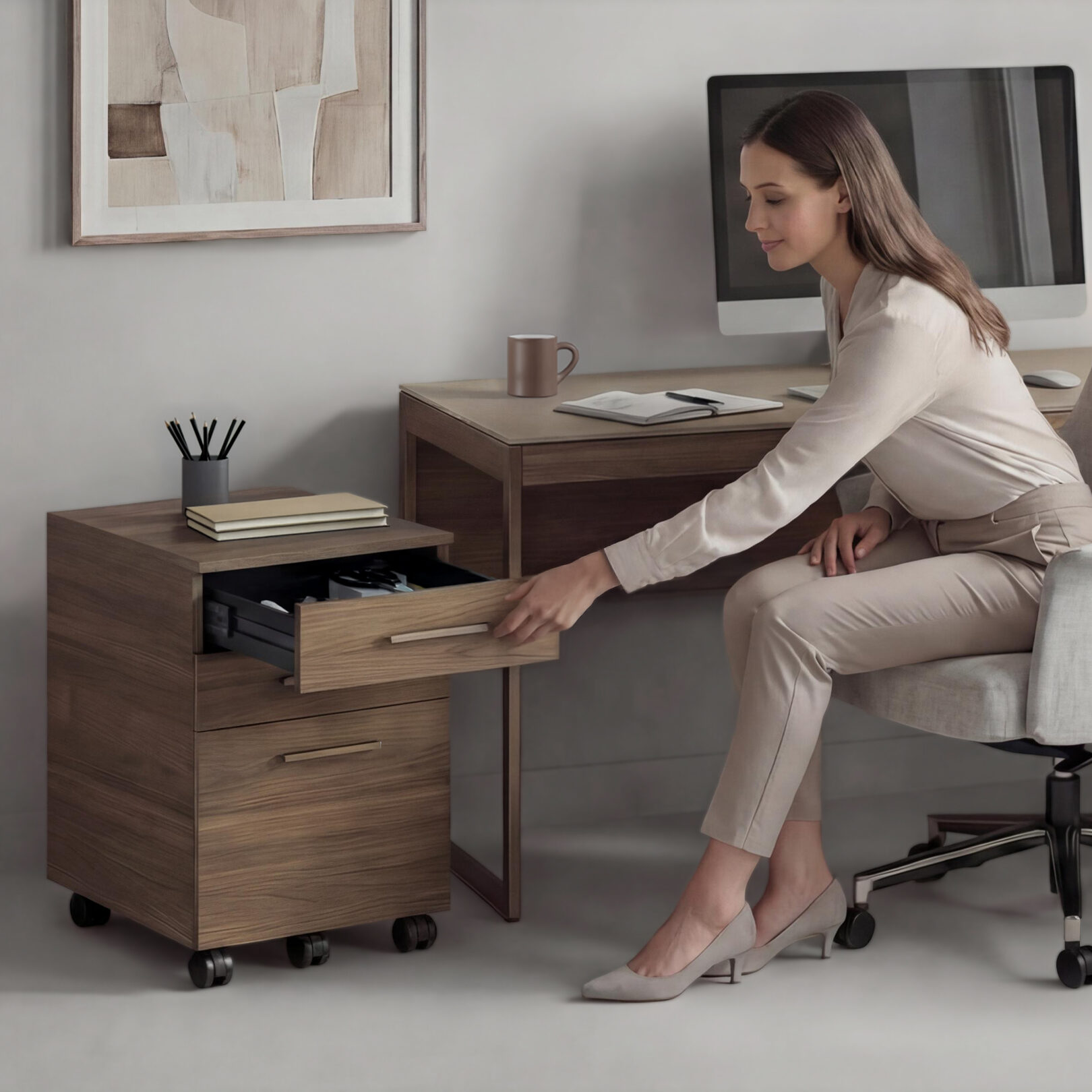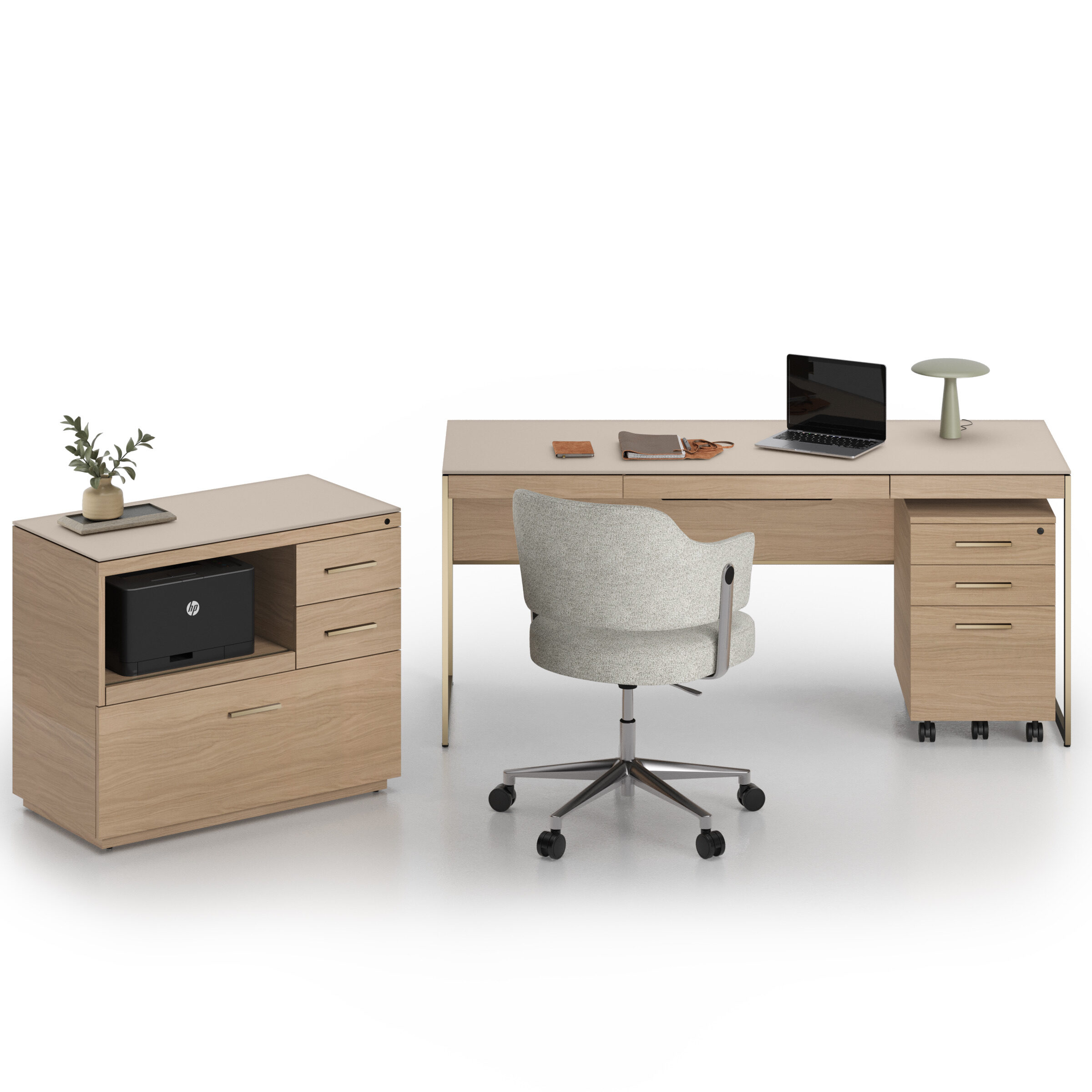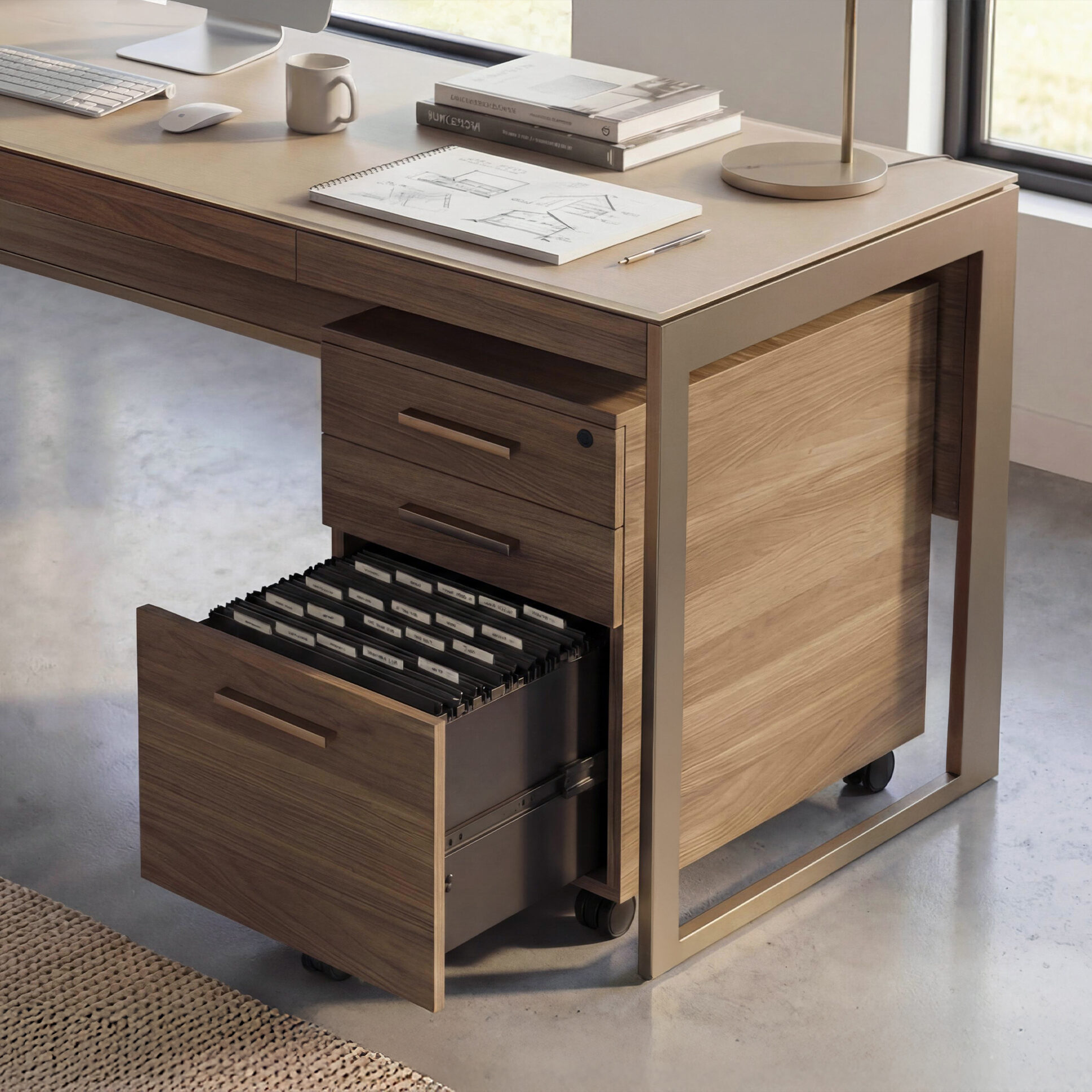 Sequel Studio features a streamlined desk collection with adaptable storage. The compact Sequel Studio Mobile File cabinet moves with the work, designed to stay close at hand.