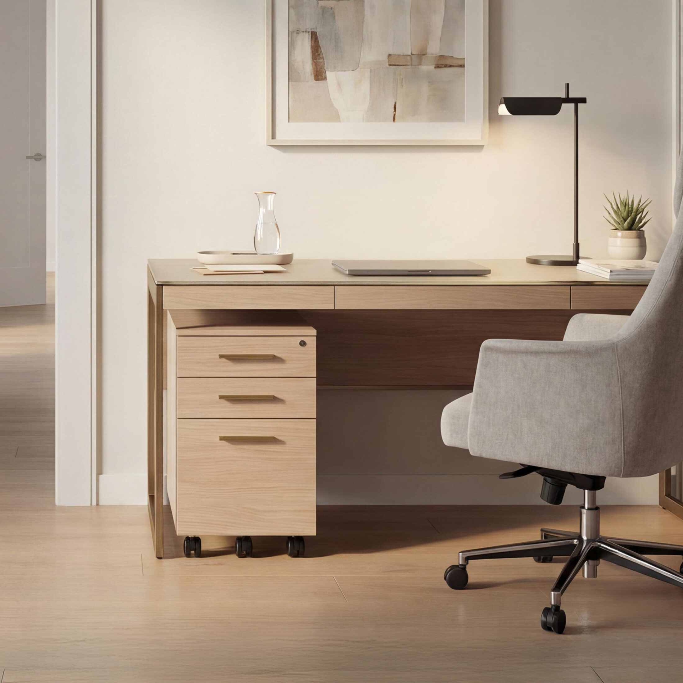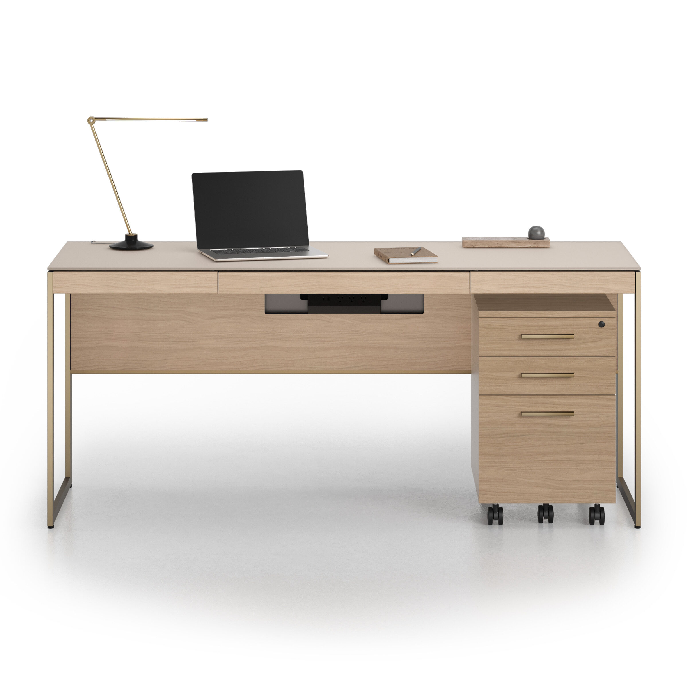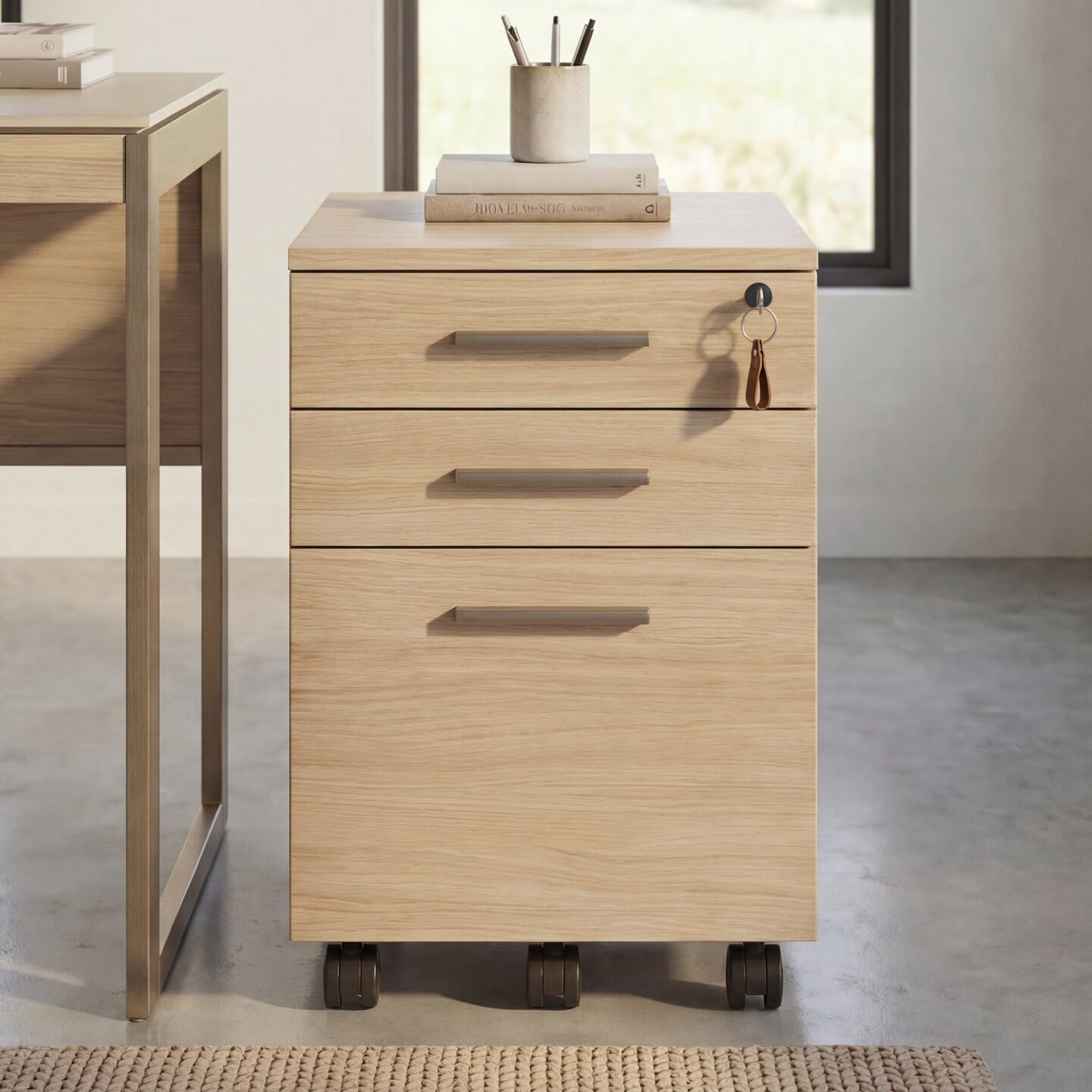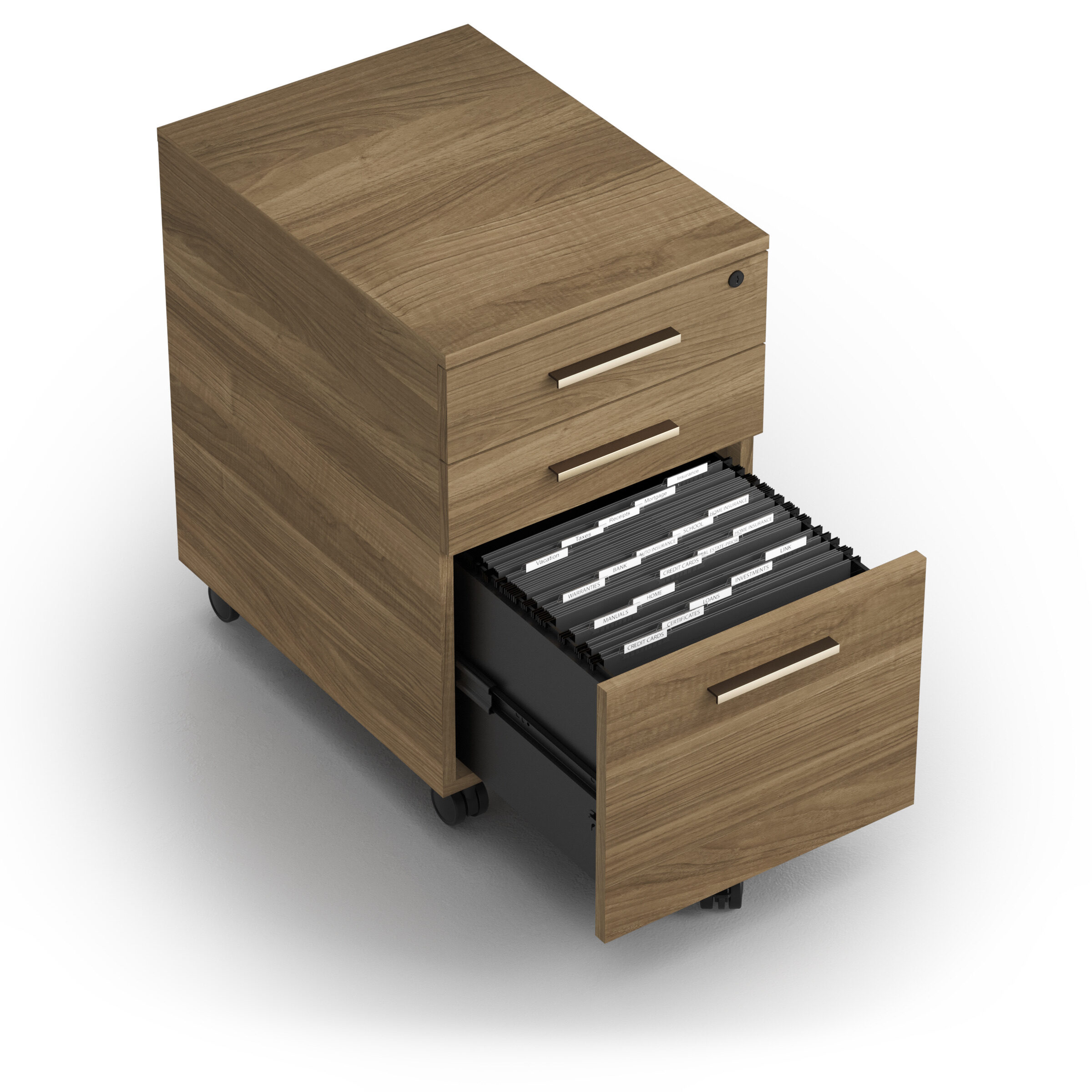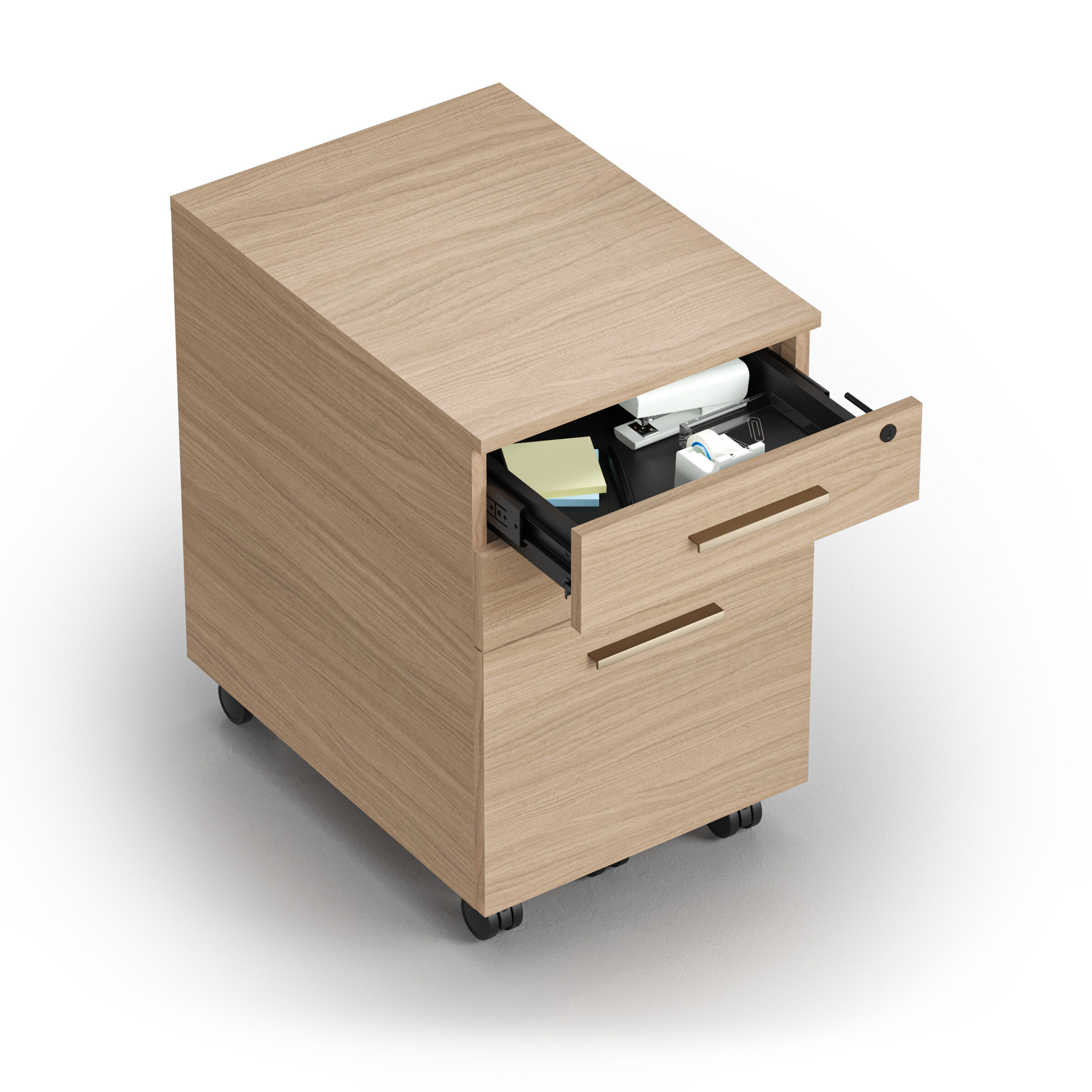 The pedestal moves easily on locking casters, remaining securely in place when needed. Two upper drawers organize everyday essentials, while a full-extension file drawer accommodates legal files. All drawers secure with a single lock, keeping files and personal items protected in shared.