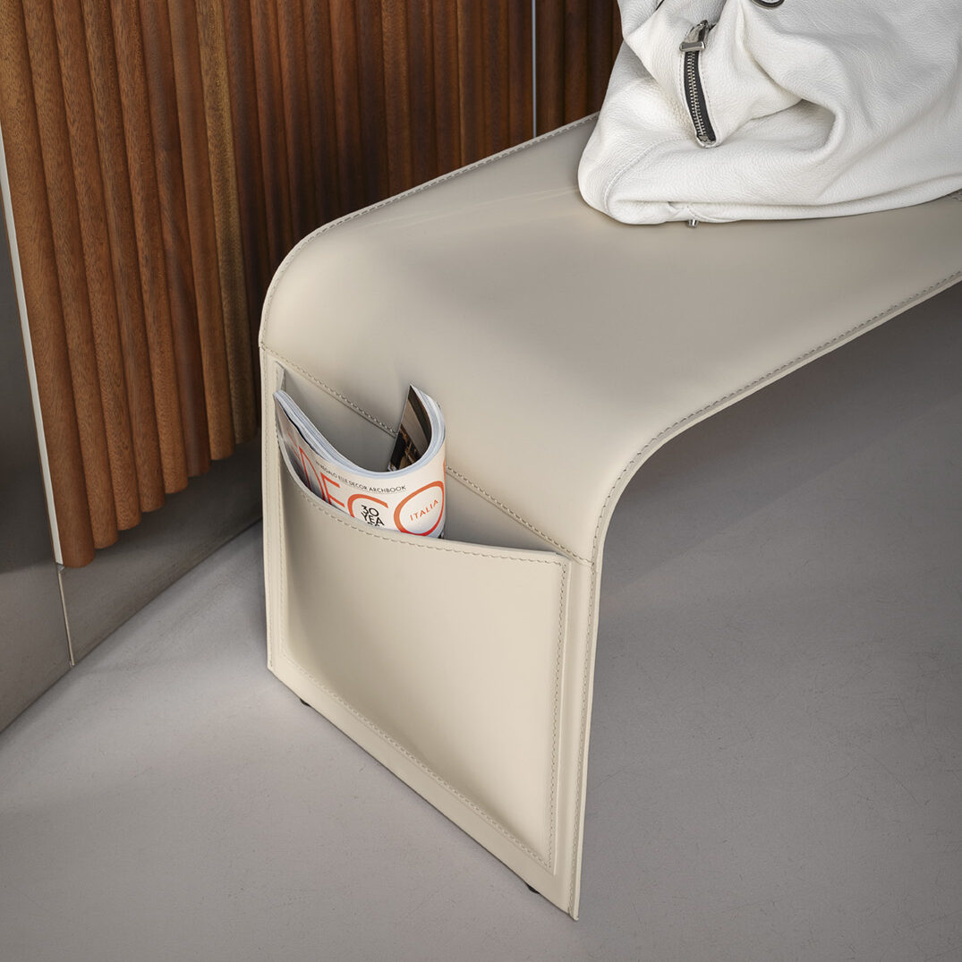 The Shape bench is the perfect accessory for your entryway. Wrapped in thick, genuine hide leather, the Shapes provides a chic touch of comfort. Its compact dimensions and twin side pockets make this a versatile piece in living or lounge quarters alike.