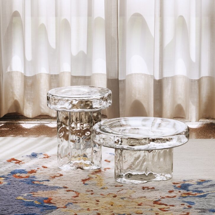 The award-winning Soda by Miniforms was born upside-down, with a puff of air. It weighs 20 kilos, and it is blown, drawn out and shaped by three master glassmakers. The result is a single volume of glass with three large petals forming the stem. With Soda Occasional Table Collection, the glass vibrates: its tough, hammered surface fragments its transparency to give a primitive aesthetic. This is artistic value granted to an industrial product. Choose from a side or coffee table configuration with Soda by miniforms.