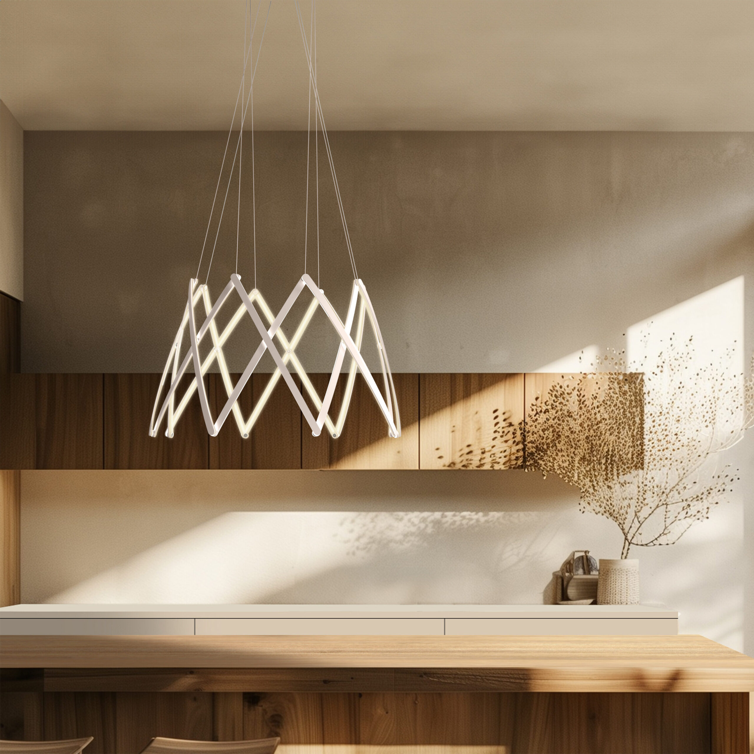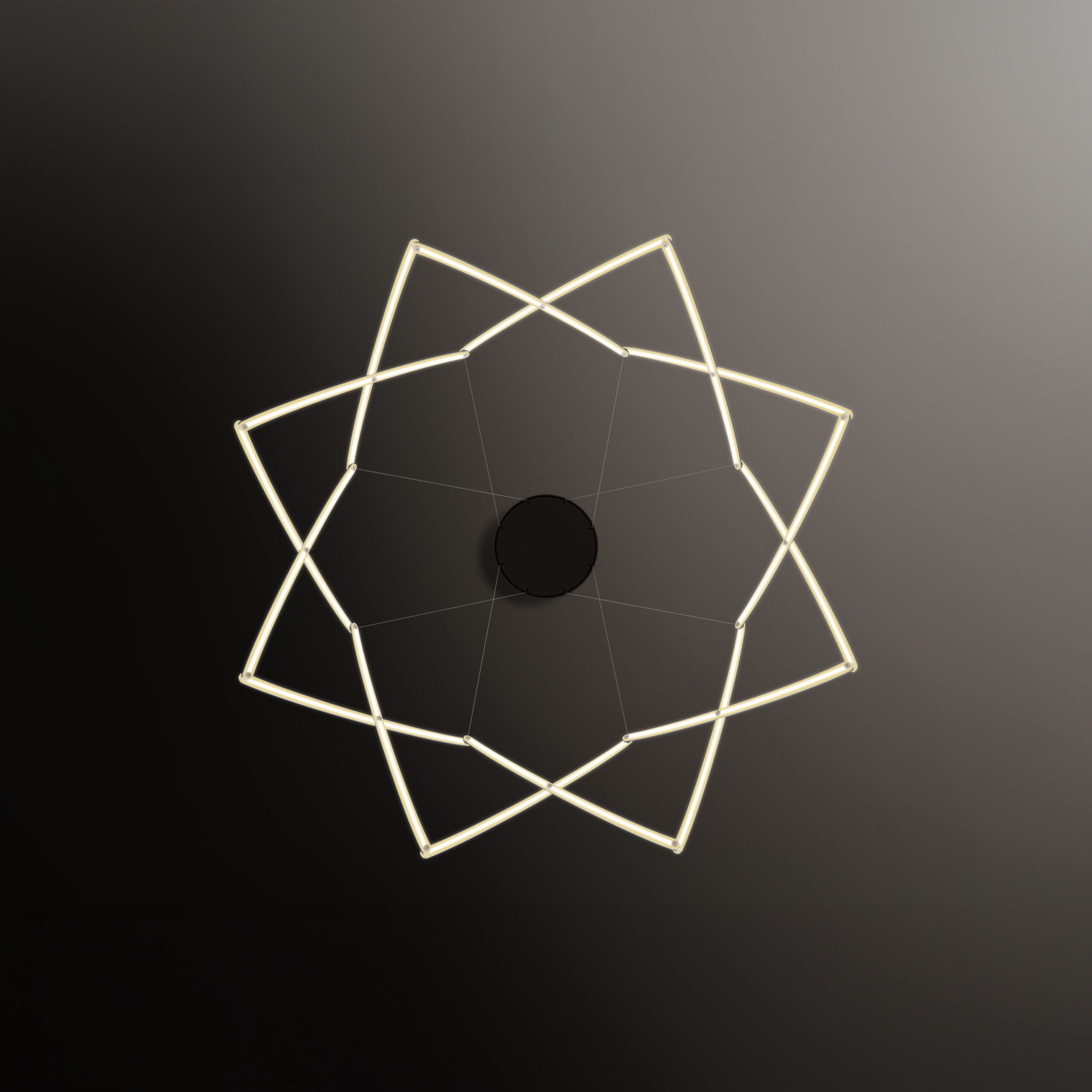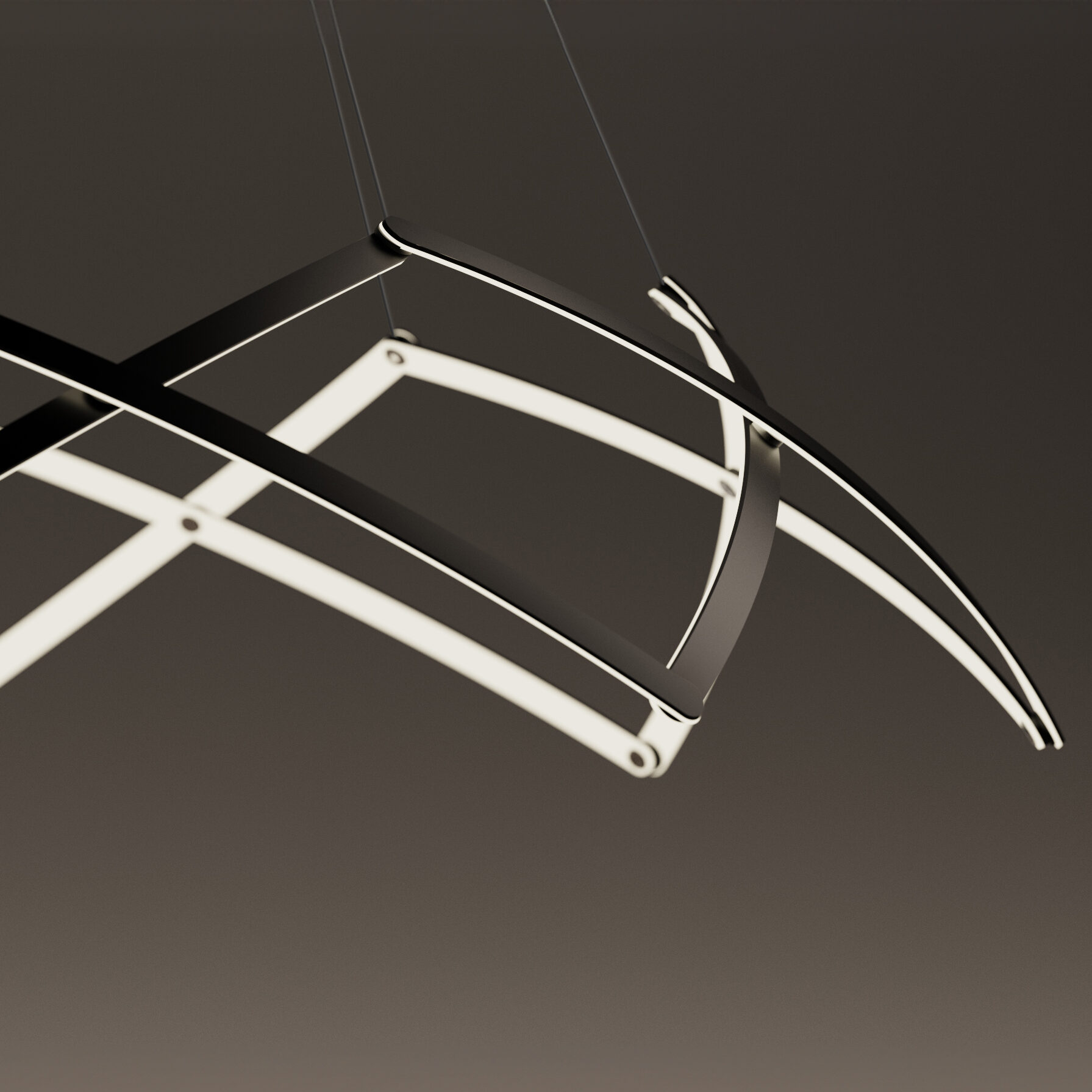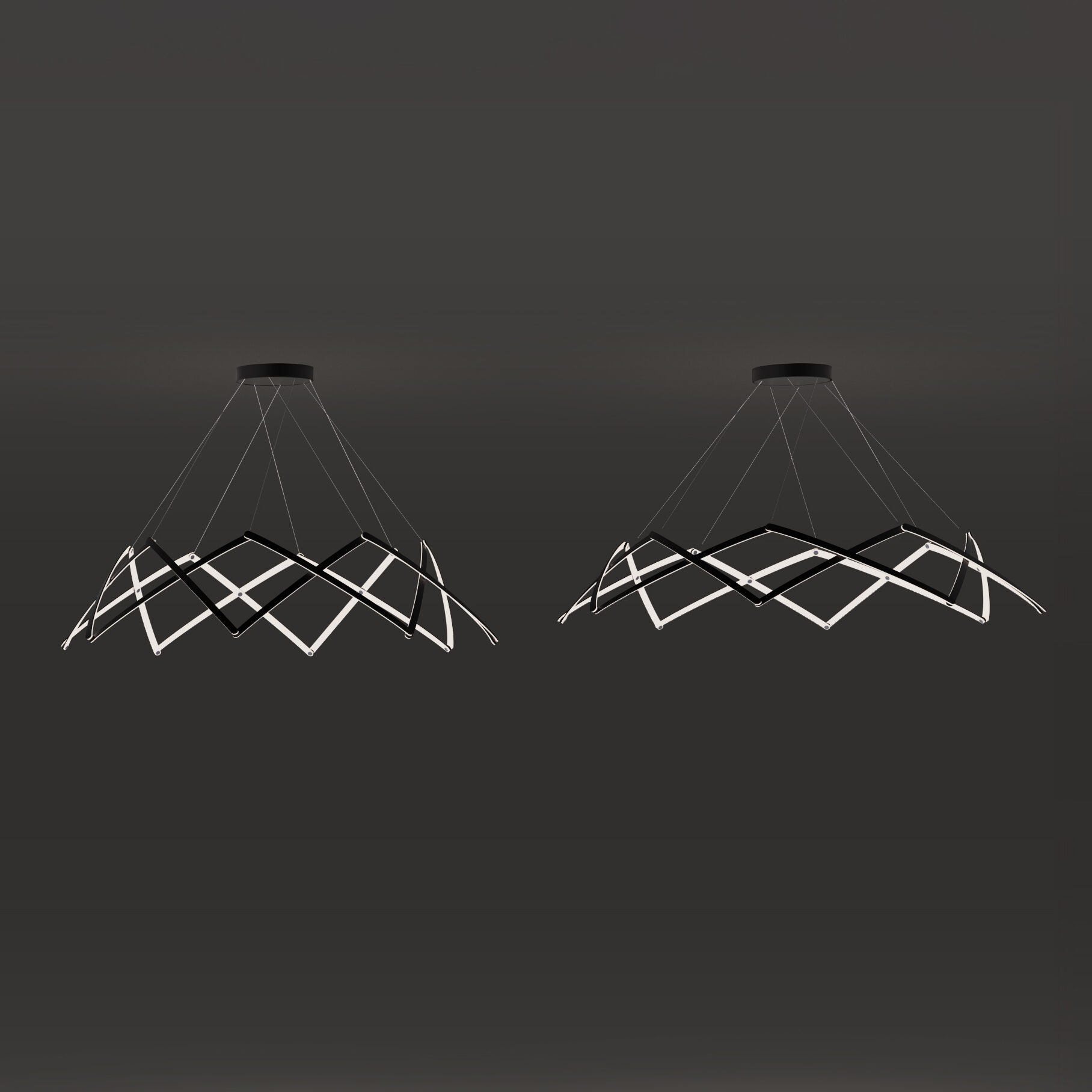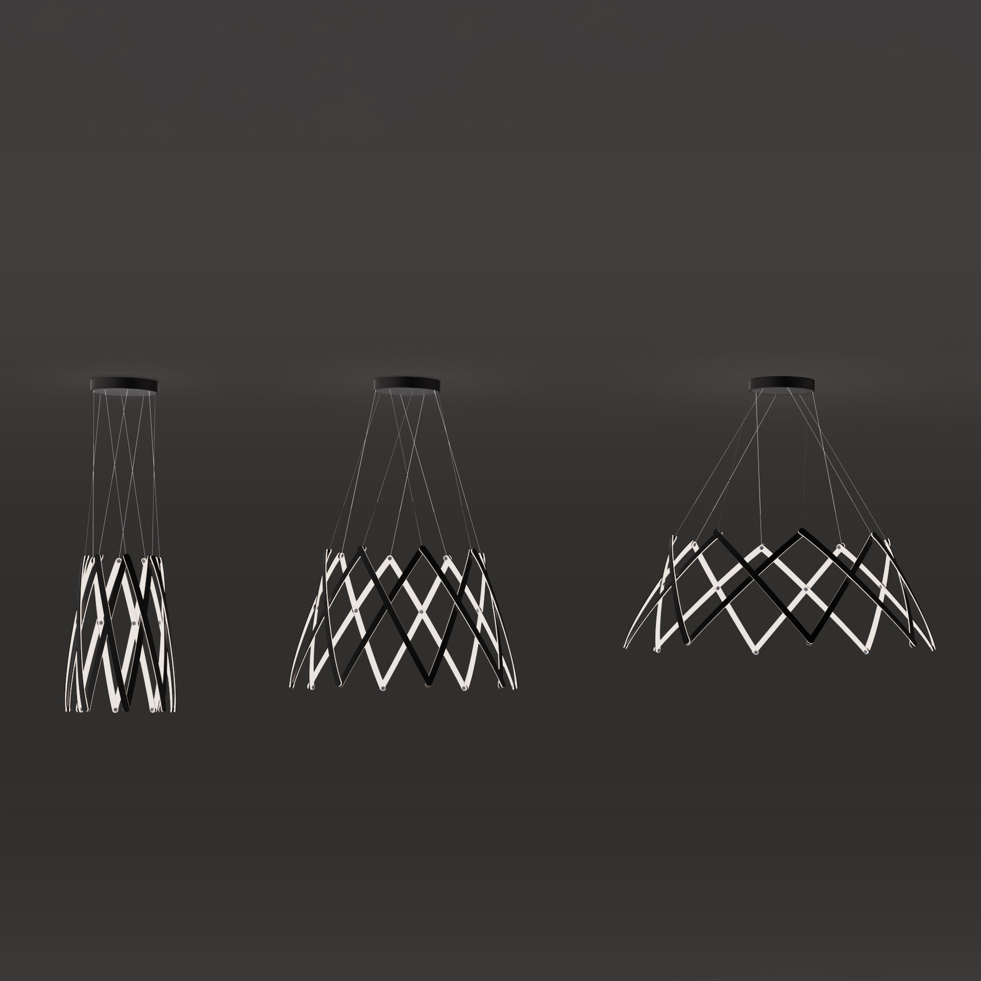 Stella is a dynamic pendant light that can be effortlessly expanded to a wide range of sizes from 10”(25.4 cm) to 59” (150cm) in diameter depending on user needs. Made up of multiple interwoven aluminum arm segments with strategically placed pivot joints, this dynamic fixture transforms from inward facing illumination to downward facing direct lighting when expanded outward.