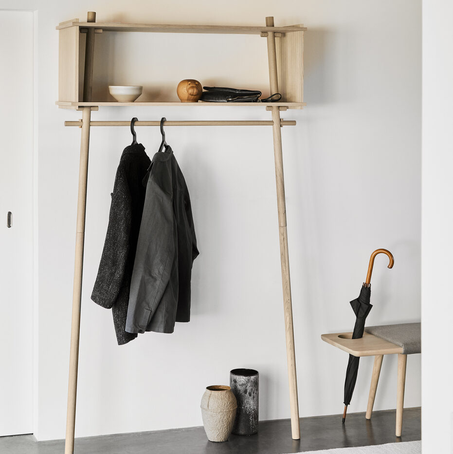 Töjbox is a simplistic and functional wardrobe made of oak. The design is ideal for the entrance, bedroom or walk-in closet. Use the clothes rack to hang your shirts and jackets and store your every day belongings or favourite decorations in the box, while the angled legs leave space on the floor for shoes and bags.