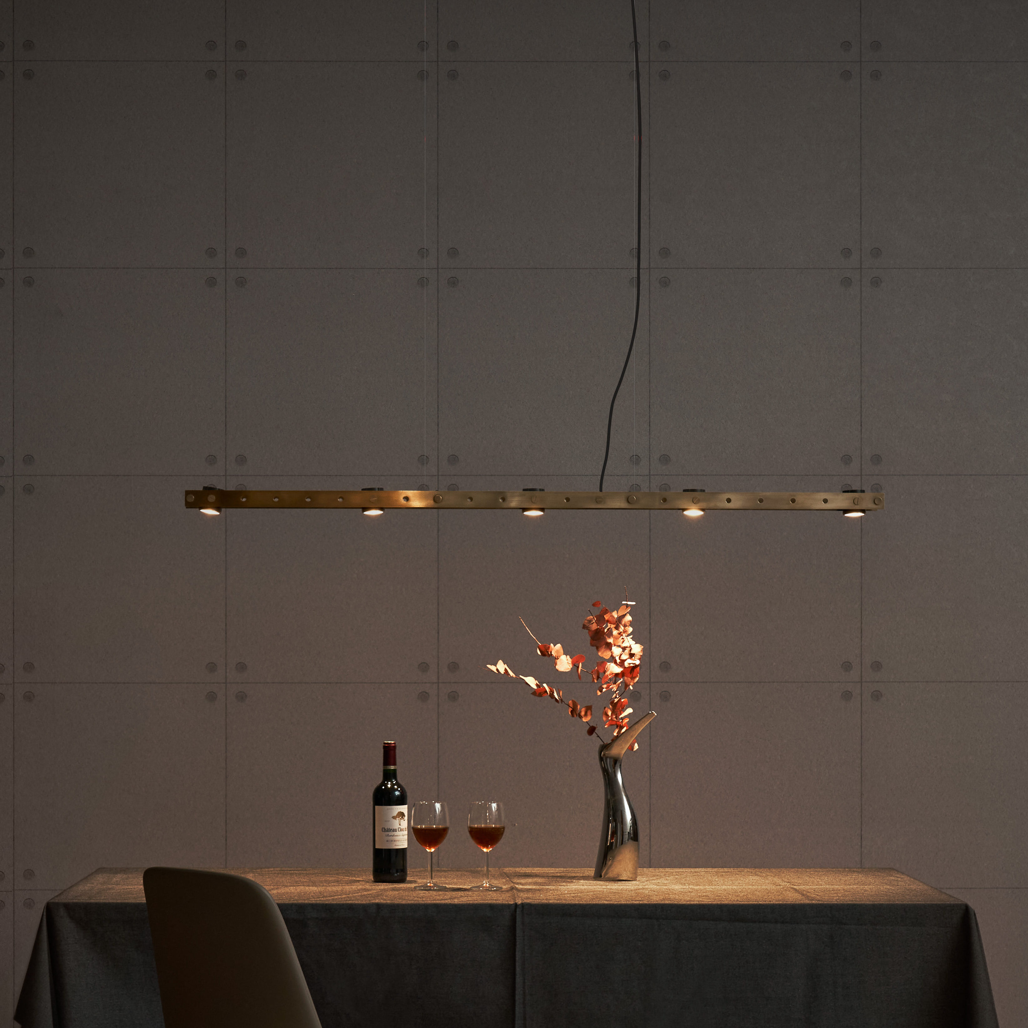 TRAM Pendant represents a cross point when nostalgia meets now, triggering off peoples’ old-time memories. Consists of genuine brass for its electric conductivity, the lamp spots wirelessly connect to the brass track, which can be relocated and 360°-rotated. The flexible luminaire can be set exactly creating various ambiance with a brilliant performance light, while its natural metallic appearance varies with time.