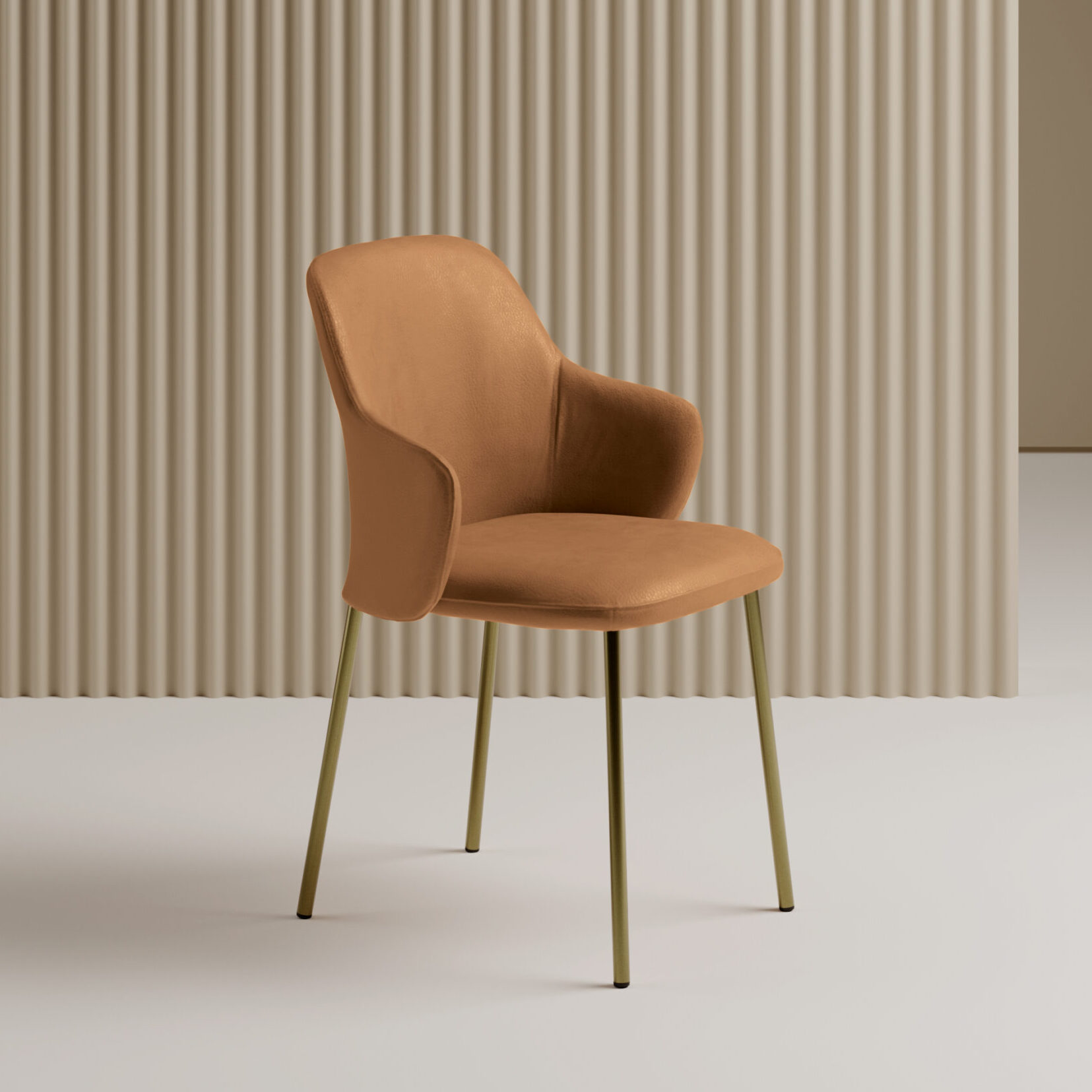Vivian is a remarkable example of versatility, blending casual elegance with luxurious comfort. Its balance silhouette plays with light, contemporary lines, where every element fits into a design language that breathes modernity and refinement. The padded and upholstered seat offer a soft, generous welcome. The tapered lacquered steel legs complete the design with a touch of refined lightness, providing stability without weighing down the form. Available with or without arms.